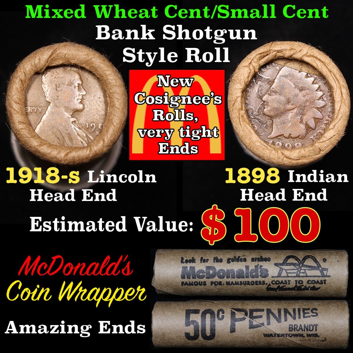 Mixed small cents 1c orig shotgun roll, 1918-s Wheat Cent, 1898 Indian Cent other end, McDonalds Wrapper. The roll is held in an old Rare & Collectable McDonalds Brandt wrapper. Look For The Golden Arches. Actual roll pictured is the roll you will get. A great original bank shotgun roll with very tight ends. We have opened a few of these rolls. They seem to be mixed small cents including Indians, Wheats, Steel cents & some Flying Eagles mixed in. These shotgun rolls are all from a new consignee. They are all frrom one Estate.
