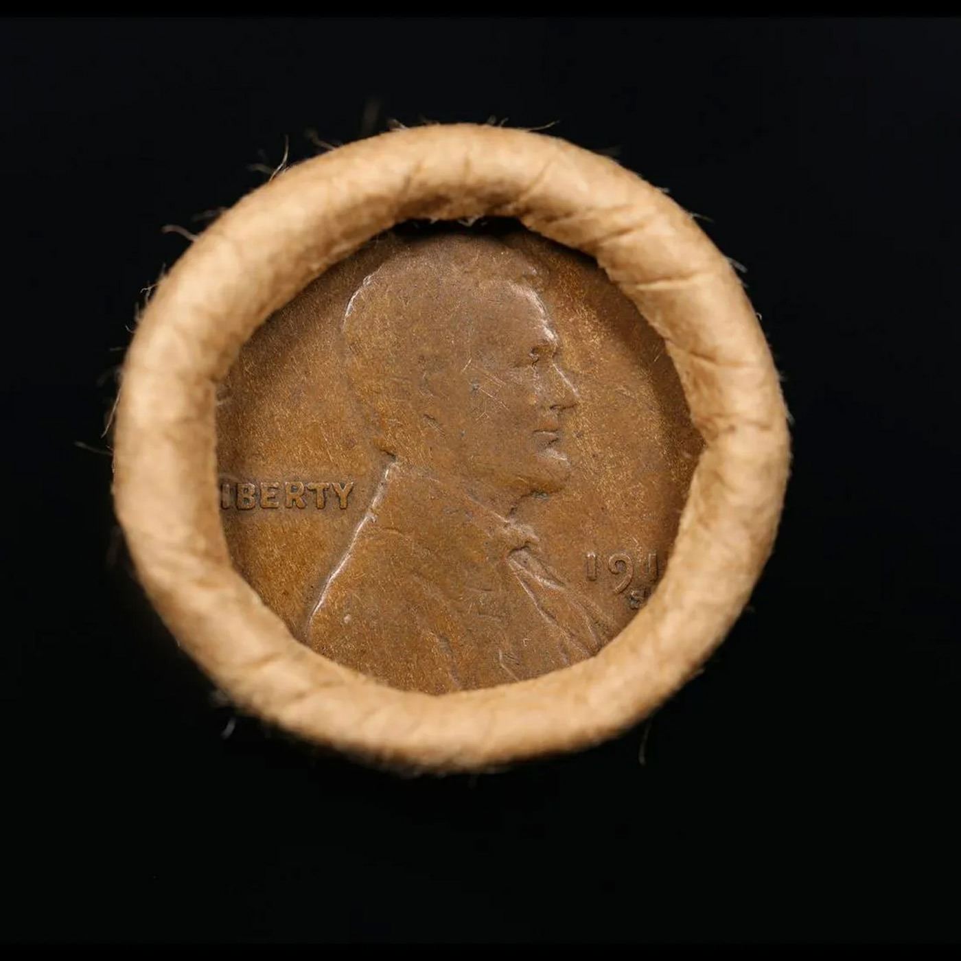Mixed small cents 1c orig shotgun roll, 1918-s Wheat Cent, 1899 Indian Cent other end, Brinks Wrappe