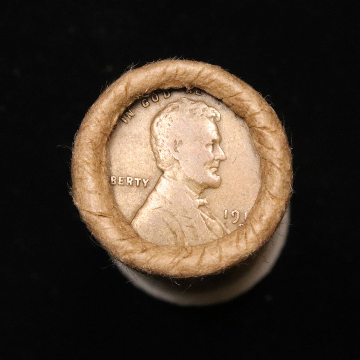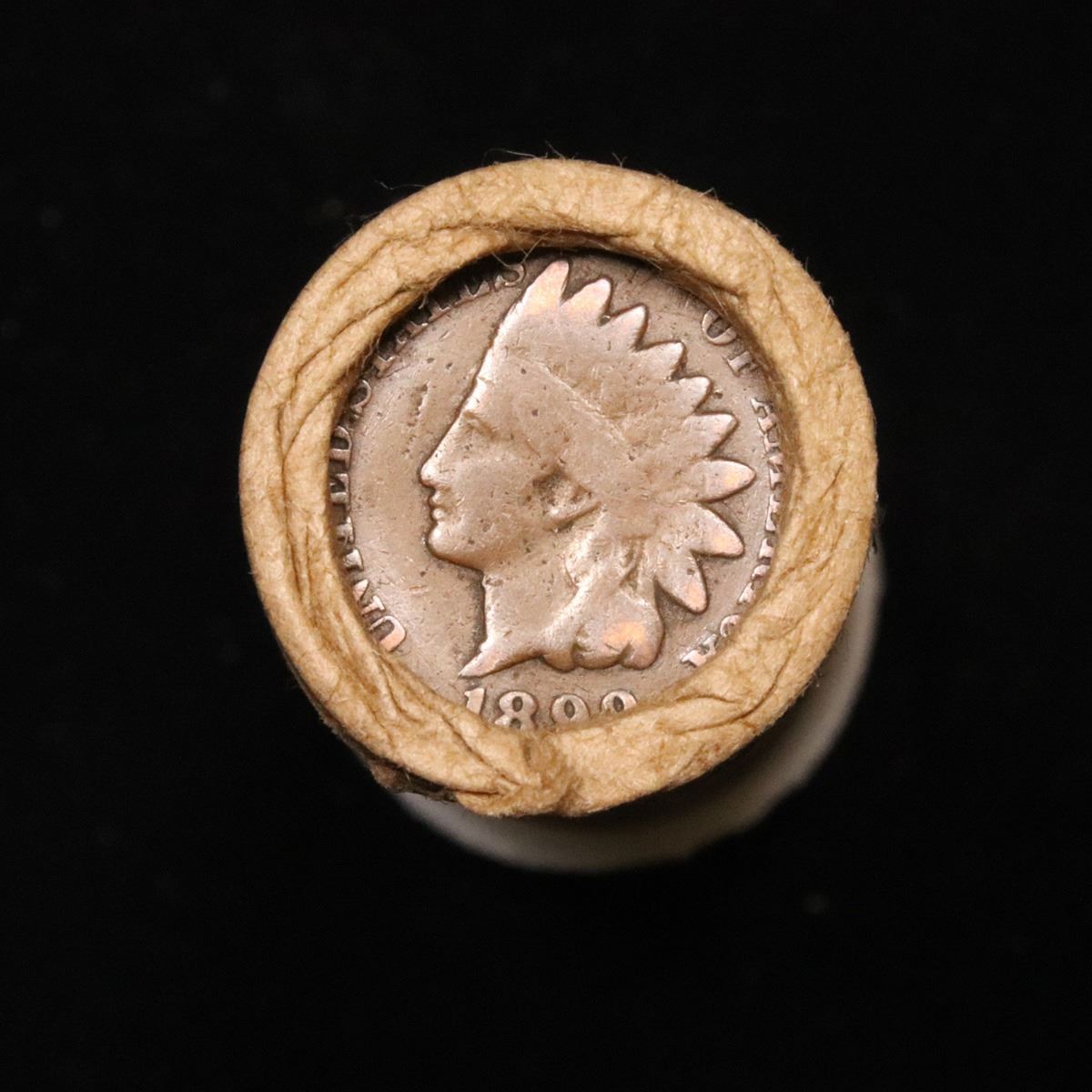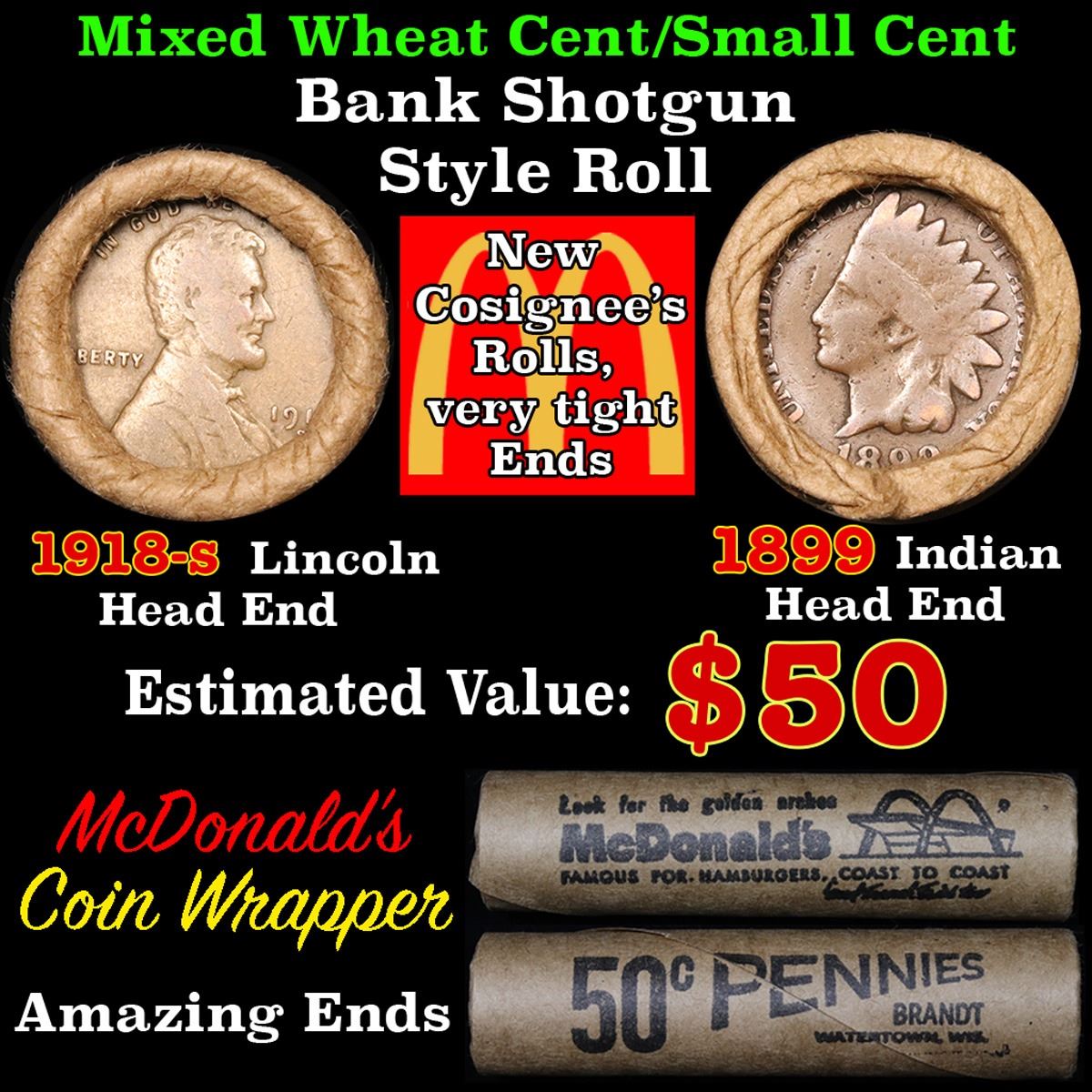 Mixed small cents 1c orig shotgun roll, 1918-s Wheat Cent, 1899 Indian Cent other end . .. The roll is held in an old Seal Strong wrapper. Actual roll pictured is the roll you will get. A great original bank shotgun roll with very tight ends. We have opened a few of these rolls. They seem to be mixed small cents including Indians, Wheats, Steel cents & some Flying Eagles mixed in. These shotgun rolls are all from a new consignee. They are all frrom one Estate.