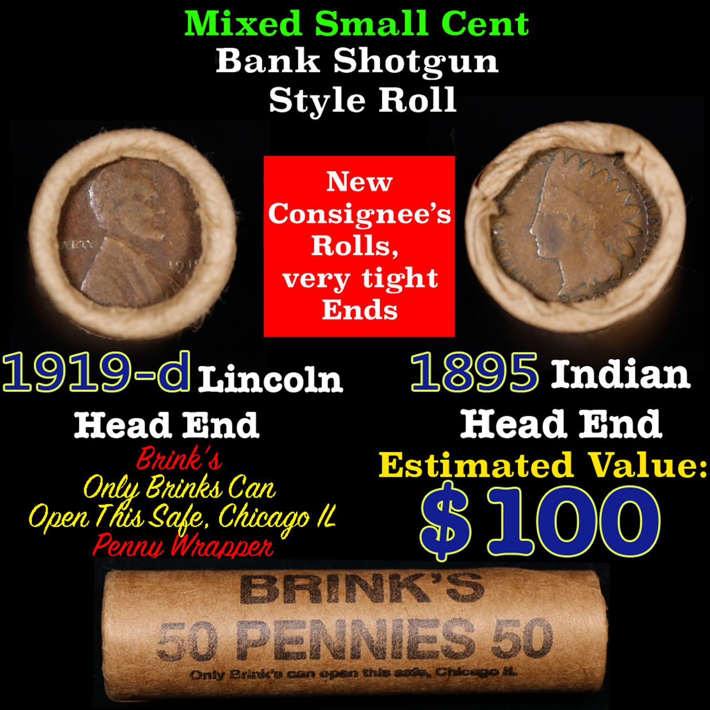 Mixed small cents 1c orig shotgun roll, 1919-D Wheat Cent, 1895 Indian Cent other end, Brinks Wrapper.. The roll is held in an old Rare & Collectable Brinks 'Only Brinks Can Open This Safe, Chicago IL' Penny wrapper. Actual roll pictured is the roll you will get. A great original bank shotgun roll with very tight ends. We have opened a few of these rolls. They seem to be mixed small cents including Indians, Wheats, Steel cents & some Flying Eagles mixed in. These shotgun rolls are all from a new consignee. They are all frrom one Estate.