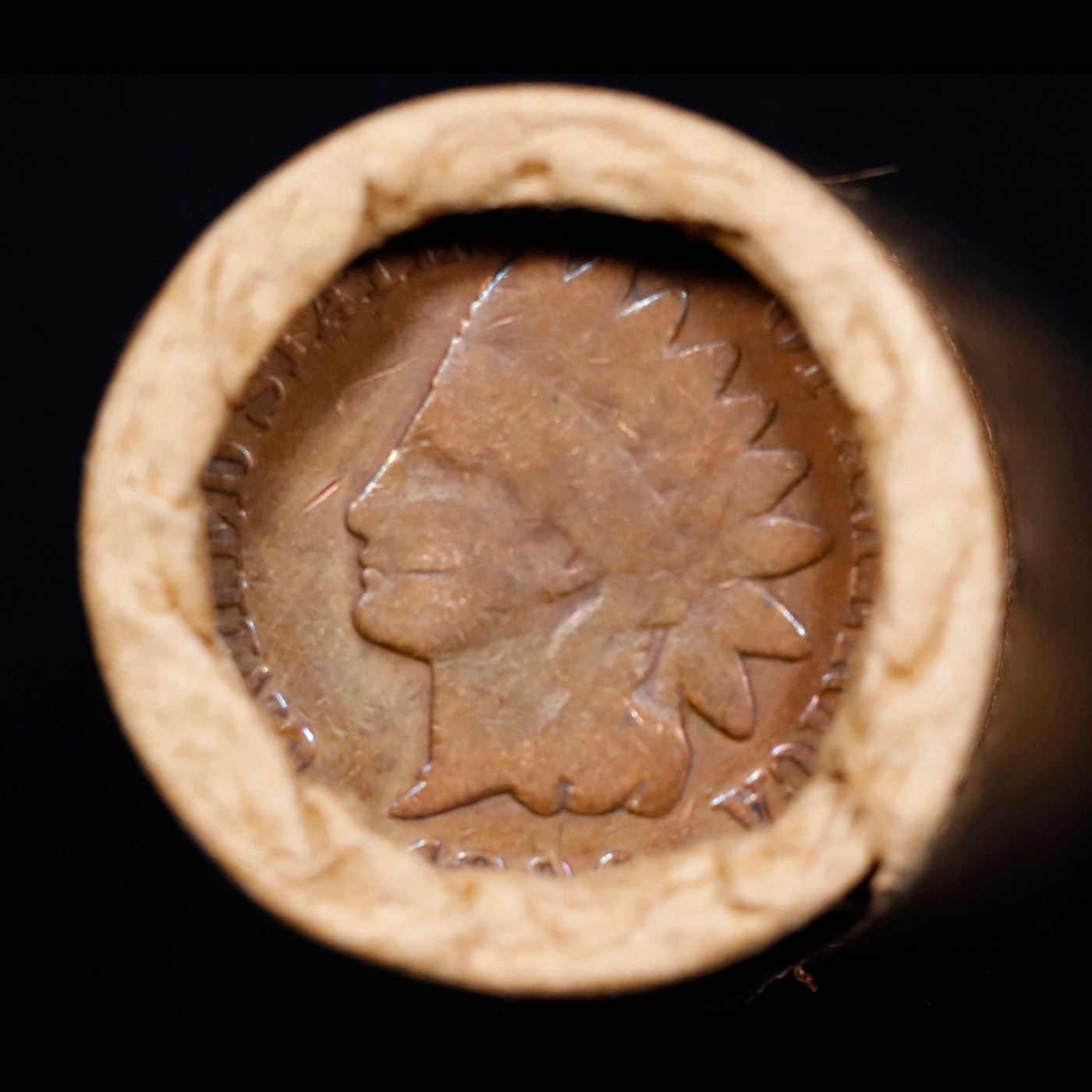 Mixed small cents 1c orig shotgun roll, 1919-S Wheat Cent, 1890 Indian Cent other end, Brinks Wrappe