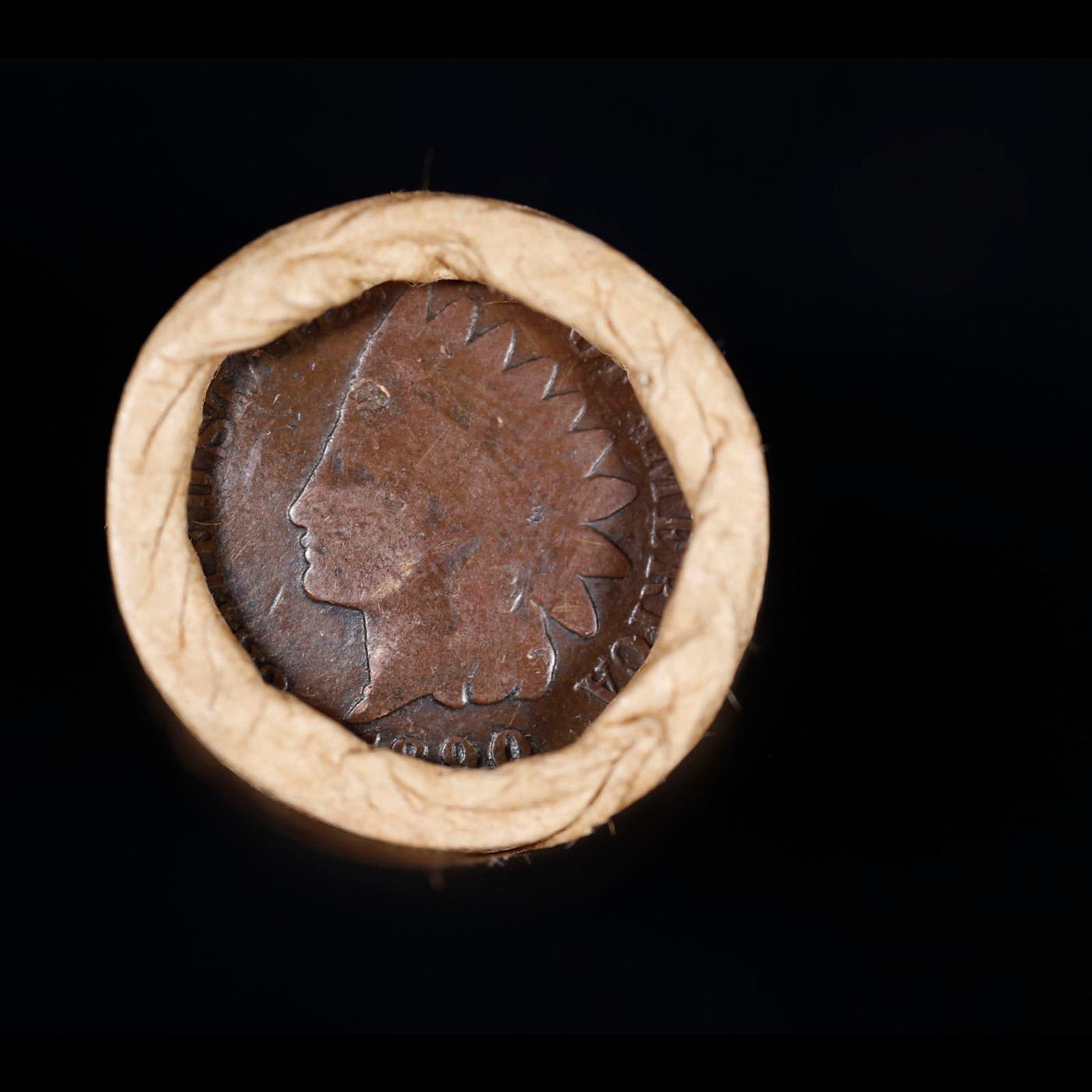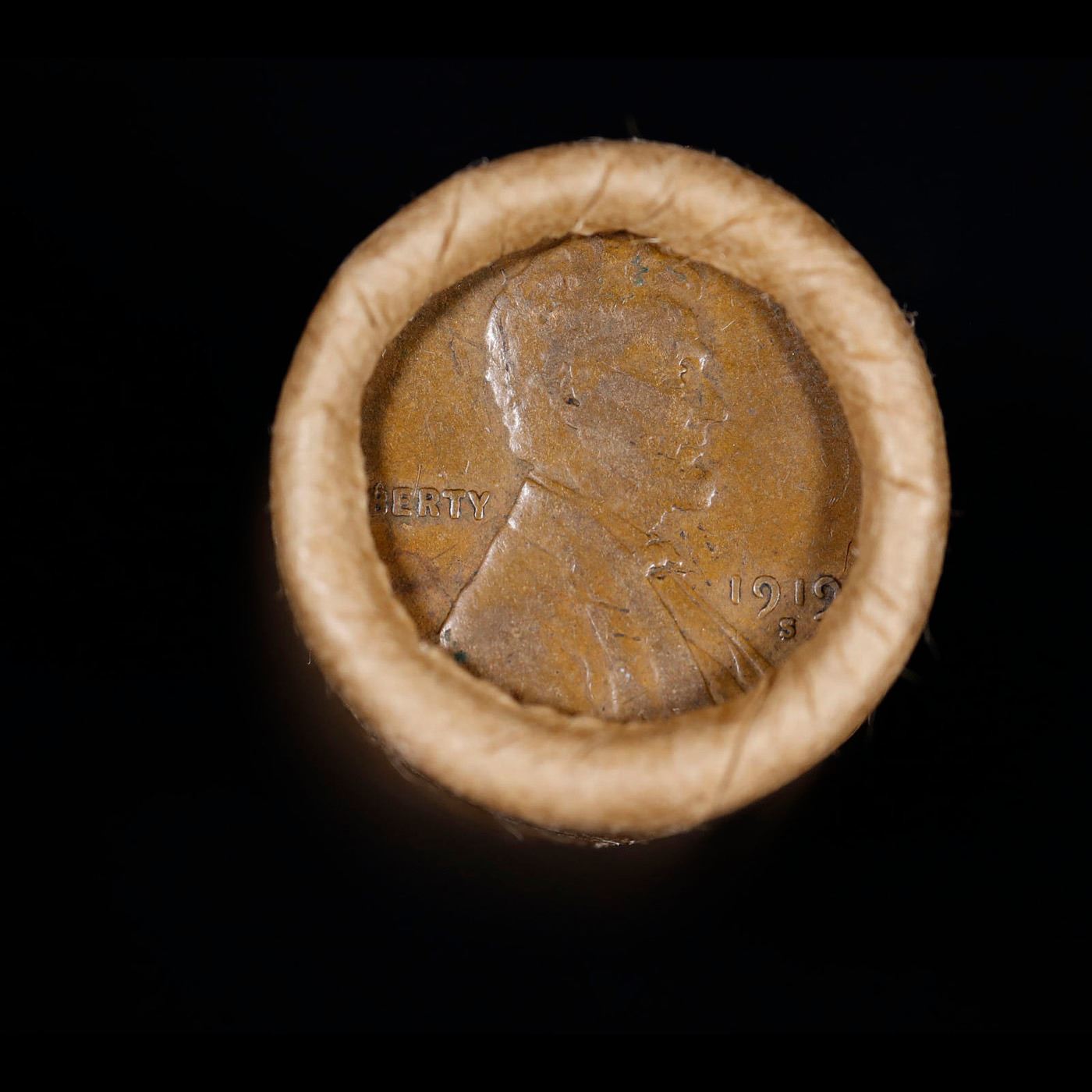 Mixed small cents 1c orig shotgun roll, 1919-S Wheat Cent, 1890 Indian Cent other end, Brinks Wrappe
