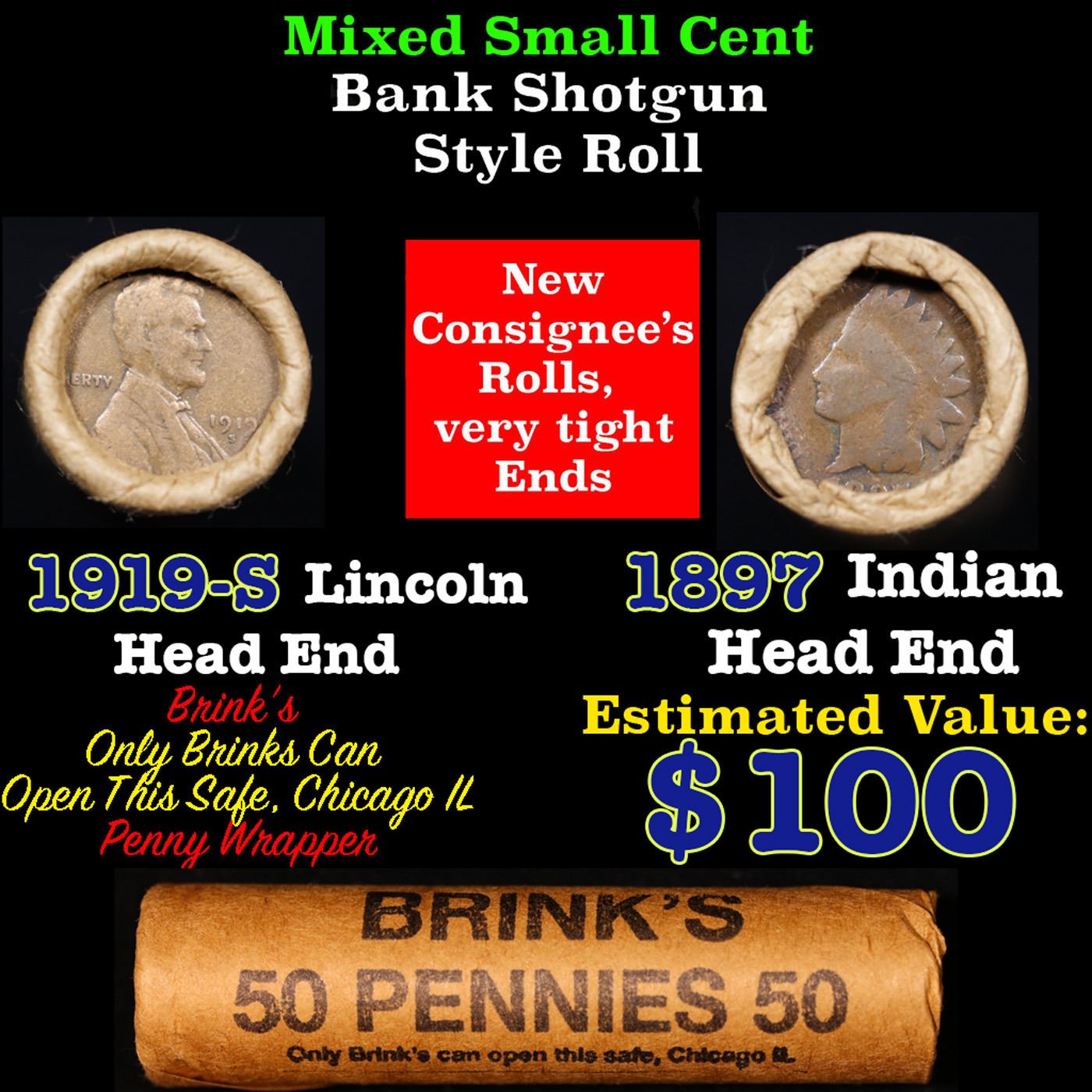 Mixed small cents 1c orig shotgun roll, 1919-S Wheat Cent, 1897 Indian Cent other end, Brinks Wrapper.. The roll is held in an old Rare & Collectable Brinks 'Only Brinks Can Open This Safe, Chicago IL' Penny wrapper. Actual roll pictured is the roll you will get. A great original bank shotgun roll with very tight ends. We have opened a few of these rolls. They seem to be mixed small cents including Indians, Wheats, Steel cents & some Flying Eagles mixed in. These shotgun rolls are all from a new consignee. They are all frrom one Estate.