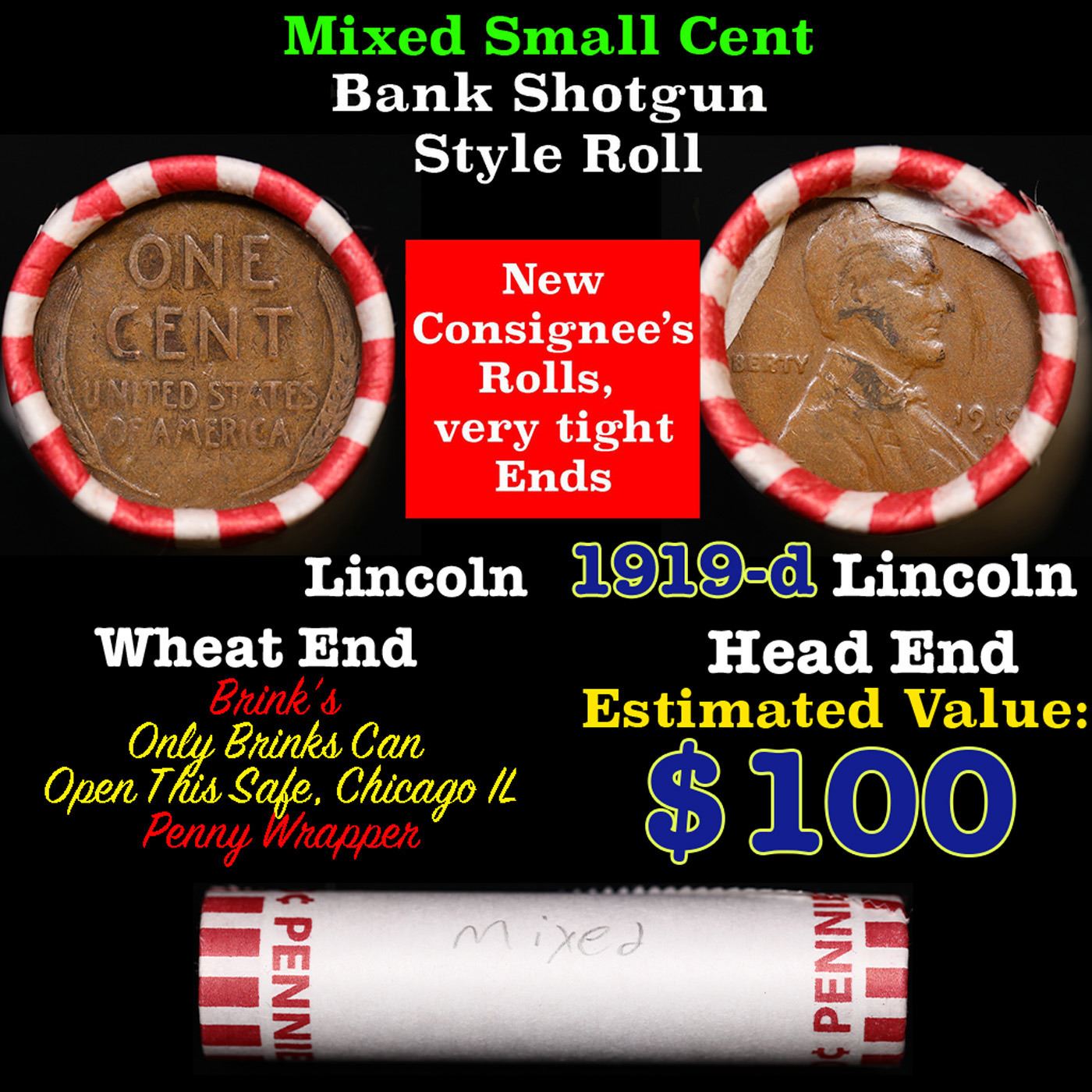 Mixed small cents 1c orig shotgun roll, 1919-d Lincoln Cent, Wheat Cent other end, Brinks Wrapper.. The roll is held in an old Rare & Collectable Brinks 'Only Brinks Can Open This Safe, Chicago IL' Penny wrapper. Actual roll pictured is the roll you will get. A great original bank shotgun roll with very tight ends. We have opened a few of these rolls. They seem to be mixed small cents including Indians, Wheats, Steel cents & some Flying Eagles mixed in. These shotgun rolls are all from a new consignee. They are all frrom one Estate.