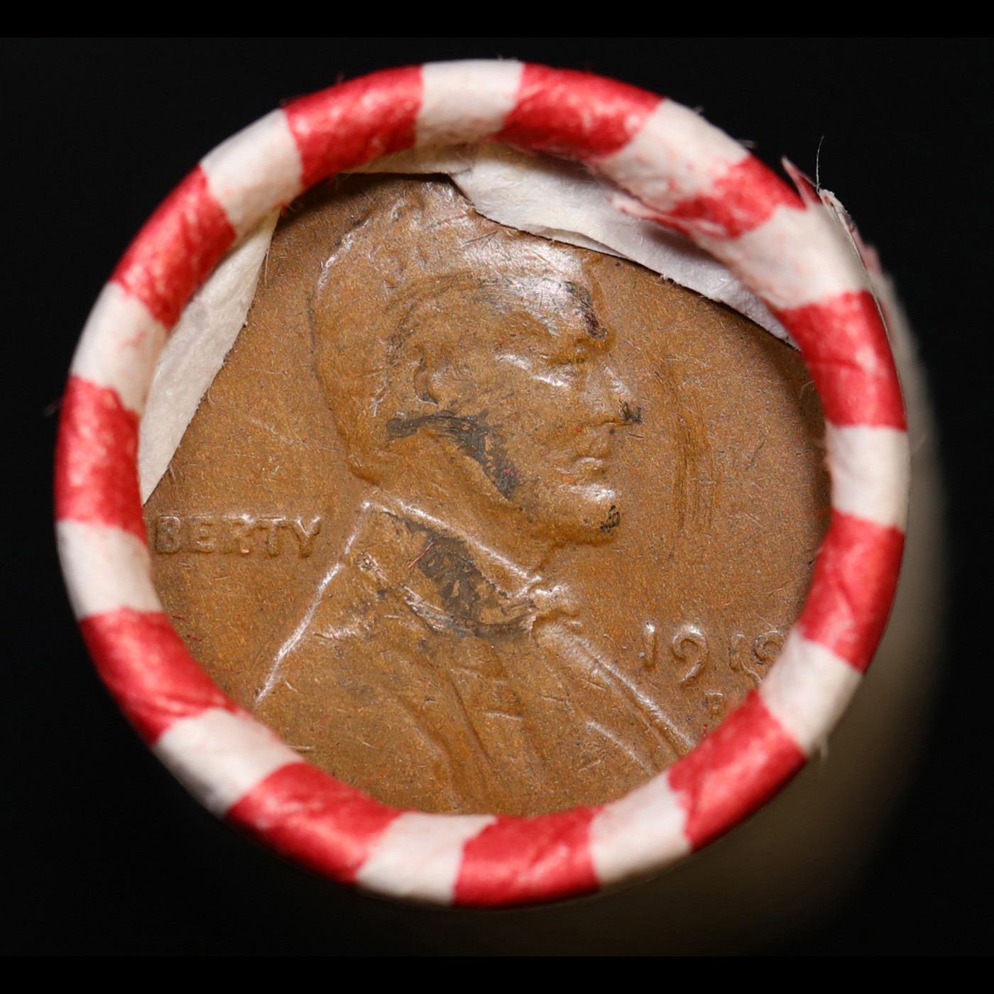 Mixed small cents 1c orig shotgun roll, 1919-d Lincoln Cent, Wheat Cent other end, Brinks Wrapper.
