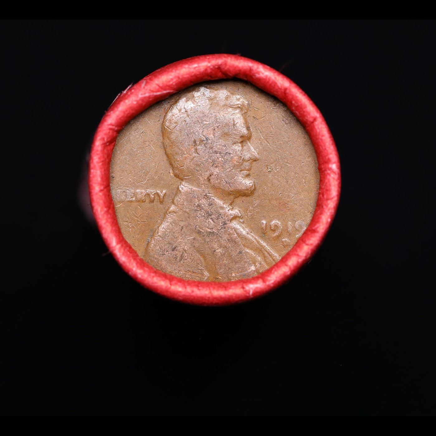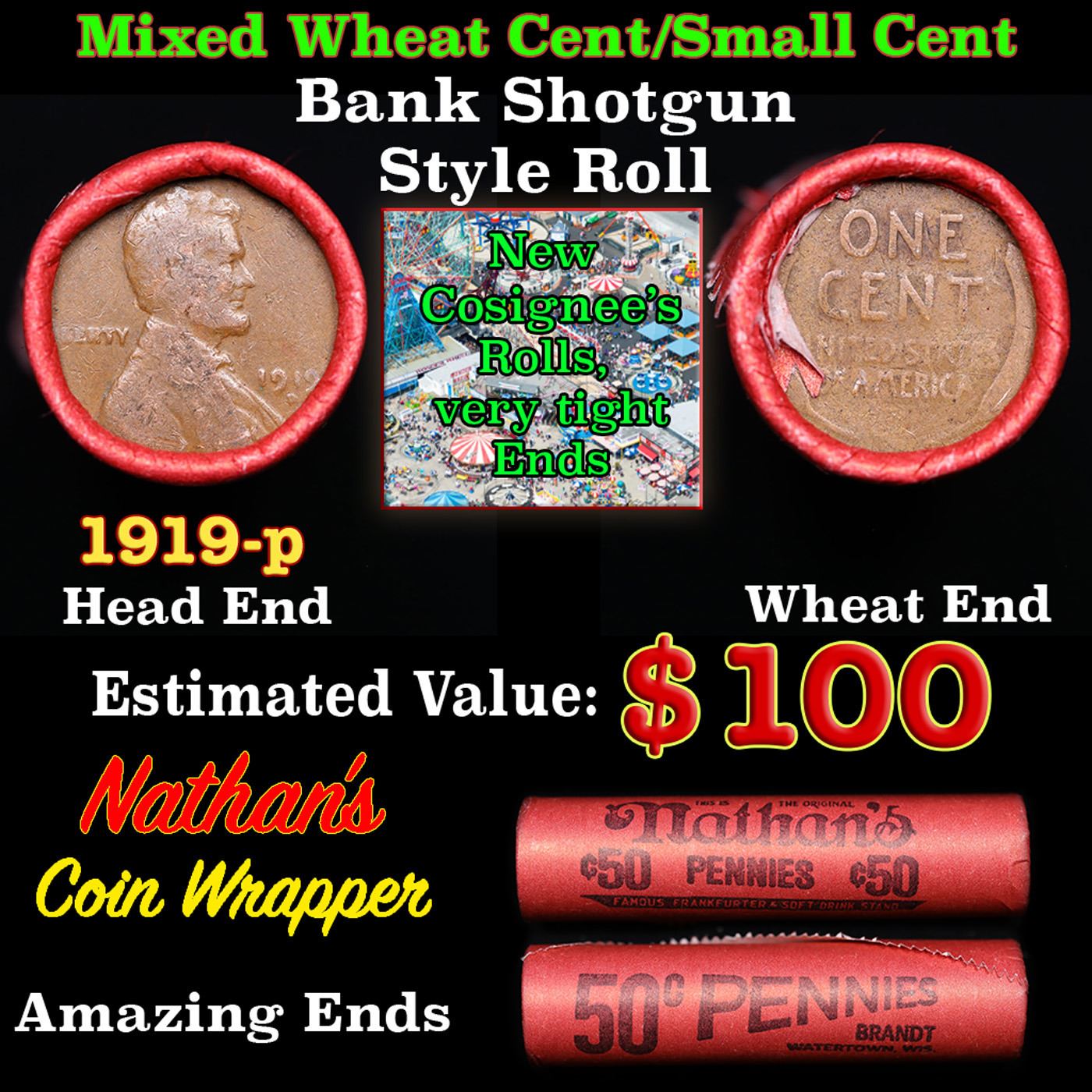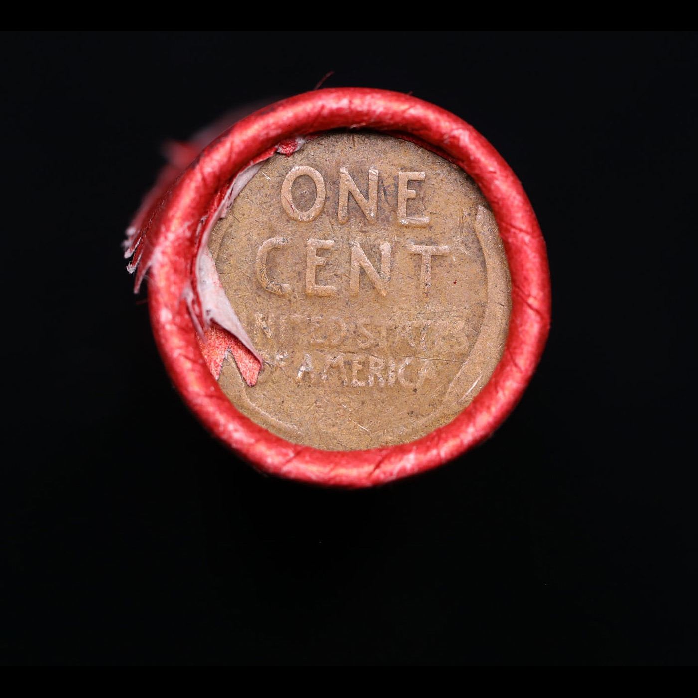 Mixed small cents 1c orig shotgun roll, 1919-d Lincoln Cent, Wheat Cent other end, Nathan's Brandt W