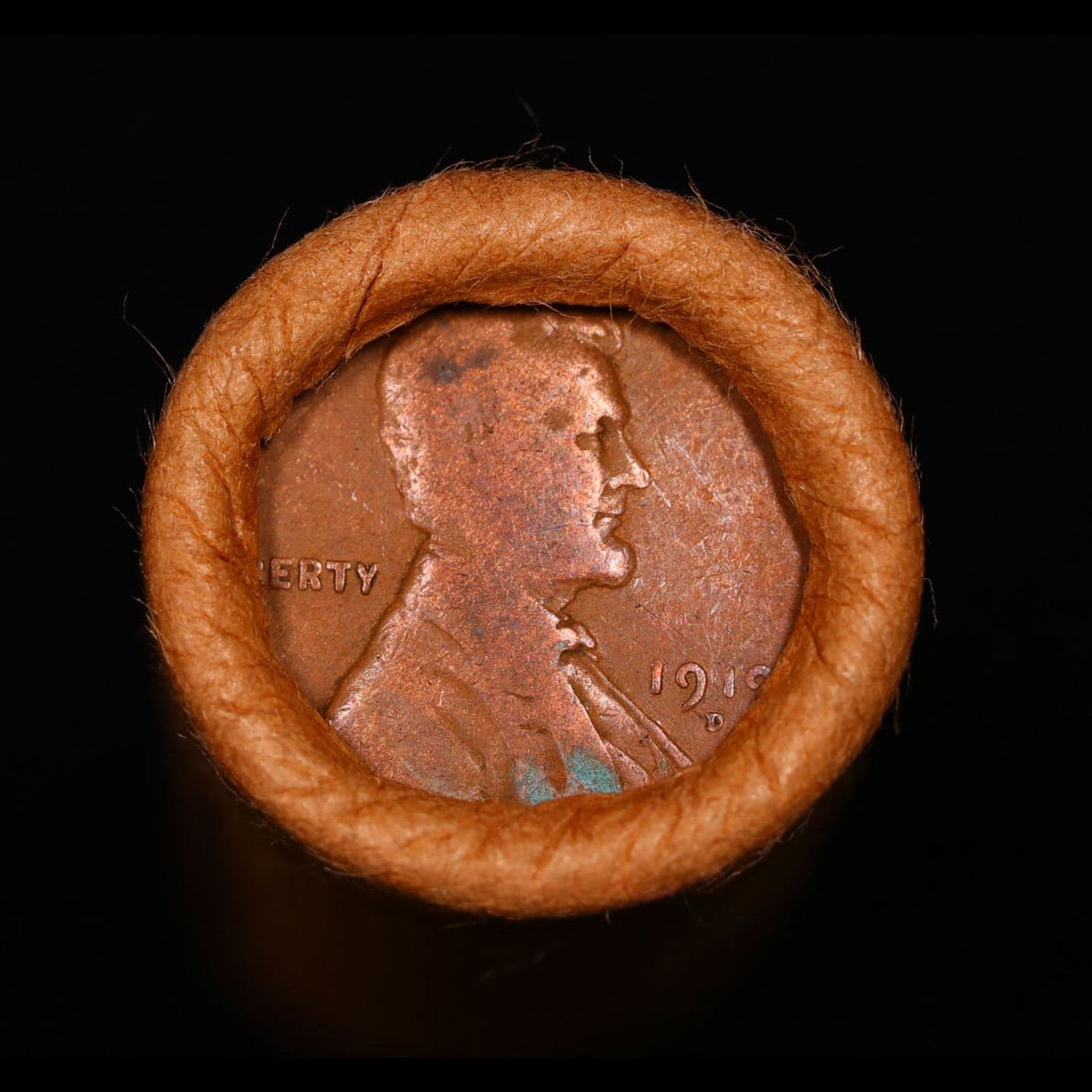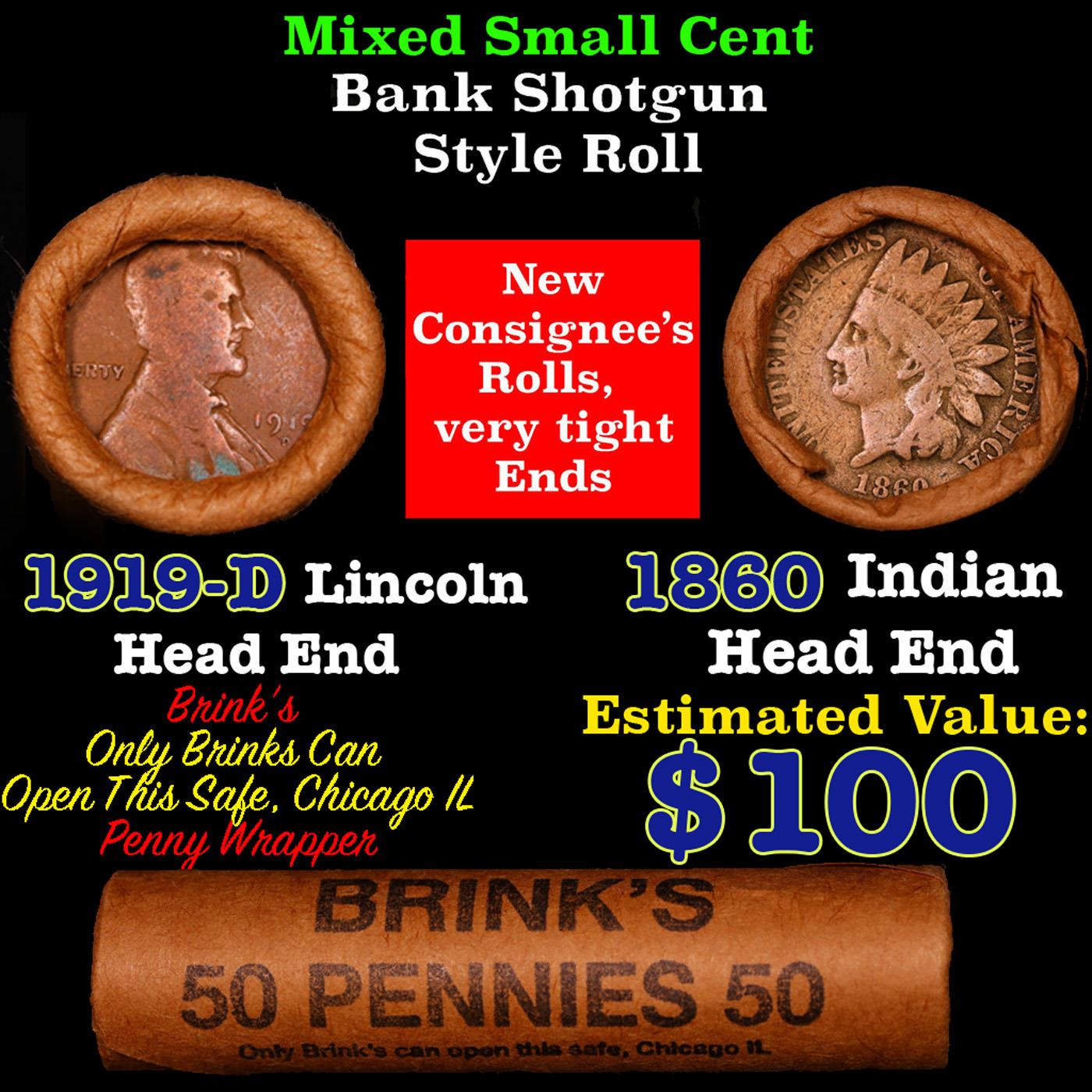 Mixed small cents 1c orig shotgun roll, 1919-d Wheat Cent, 1860 Indian Cent other end, brinks Wrappe