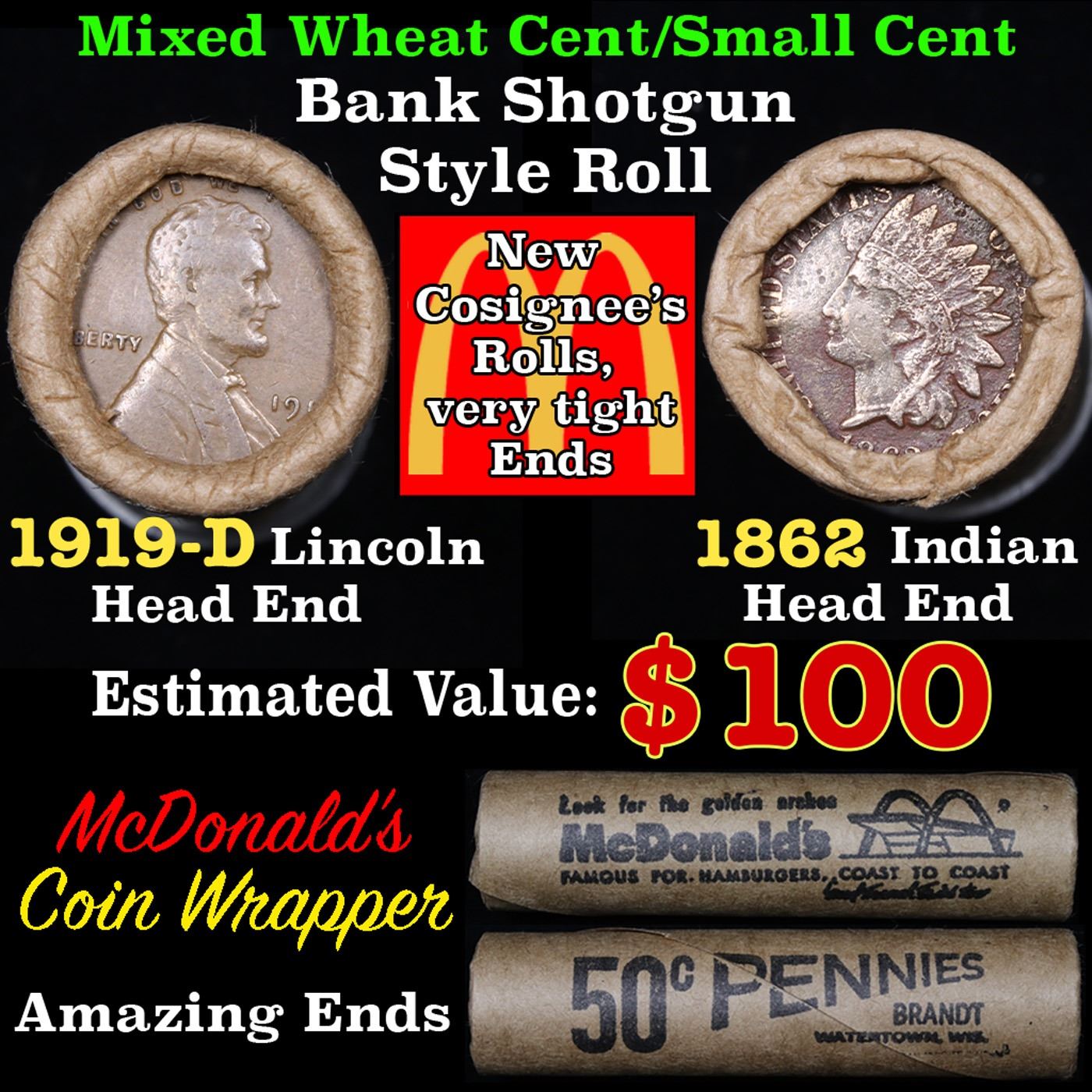 Mixed small cents 1c orig shotgun roll, 1919-d Wheat Cent, 1862 Indian Cent other end, McDonalds Wrapper Grades. The roll is held in an old Rare & Collectable McDonalds Brandt wrapper. Look For The Golden Arches. Actual roll pictured is the roll you will get. A great original bank shotgun roll with very tight ends. We have opened a few of these rolls. They seem to be mixed small cents including Indians, Wheats, Steel cents & some Flying Eagles mixed in. These shotgun rolls are all from a new consignee. They are all frrom one Estate.