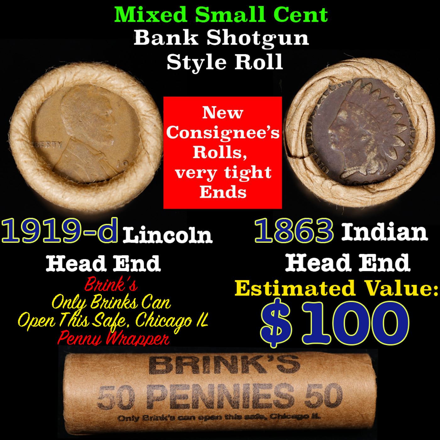 Mixed small cents 1c orig shotgun roll, 1919-d Wheat Cent, 1863 Indian Cent other end, Brinks Wrapper.. The roll is held in an old Rare & Collectable Brinks 'Only Brinks Can Open This Safe, Chicago IL' Penny wrapper. Actual roll pictured is the roll you will get. A great original bank shotgun roll with very tight ends. We have opened a few of these rolls. They seem to be mixed small cents including Indians, Wheats, Steel cents & some Flying Eagles mixed in. These shotgun rolls are all from a new consignee. They are all frrom one Estate.