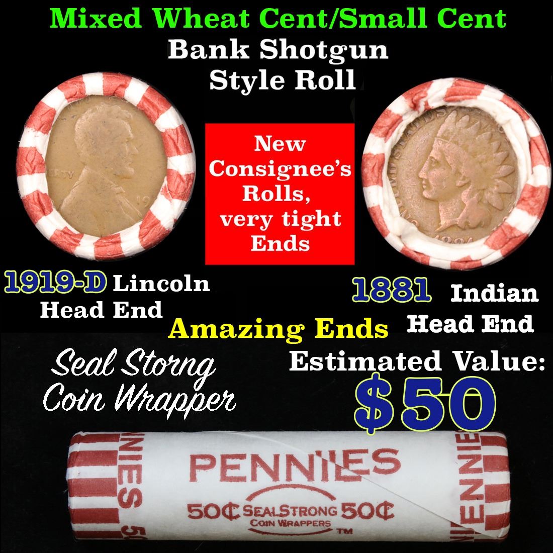 Mixed small cents 1c orig shotgun roll,1919-d Wheat Cent, 1881 Indian Cent other end. The roll is held in an old Seal Strong wrapper. Actual roll pictured is the roll you will get. A great original bank shotgun roll with very tight ends. We have been getting excellent feedback on these rolls. Were being told that close to half the roll are teens, some with mintmarks, there are a few Indians in all the rolls, most of the rolls have steel cents. They seem to be PQ Wheaties rolls. These shotgun rolls are all from a new consignee. They are all frrom one Estate.