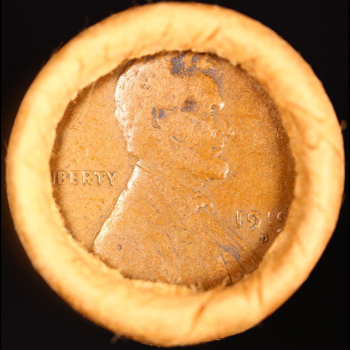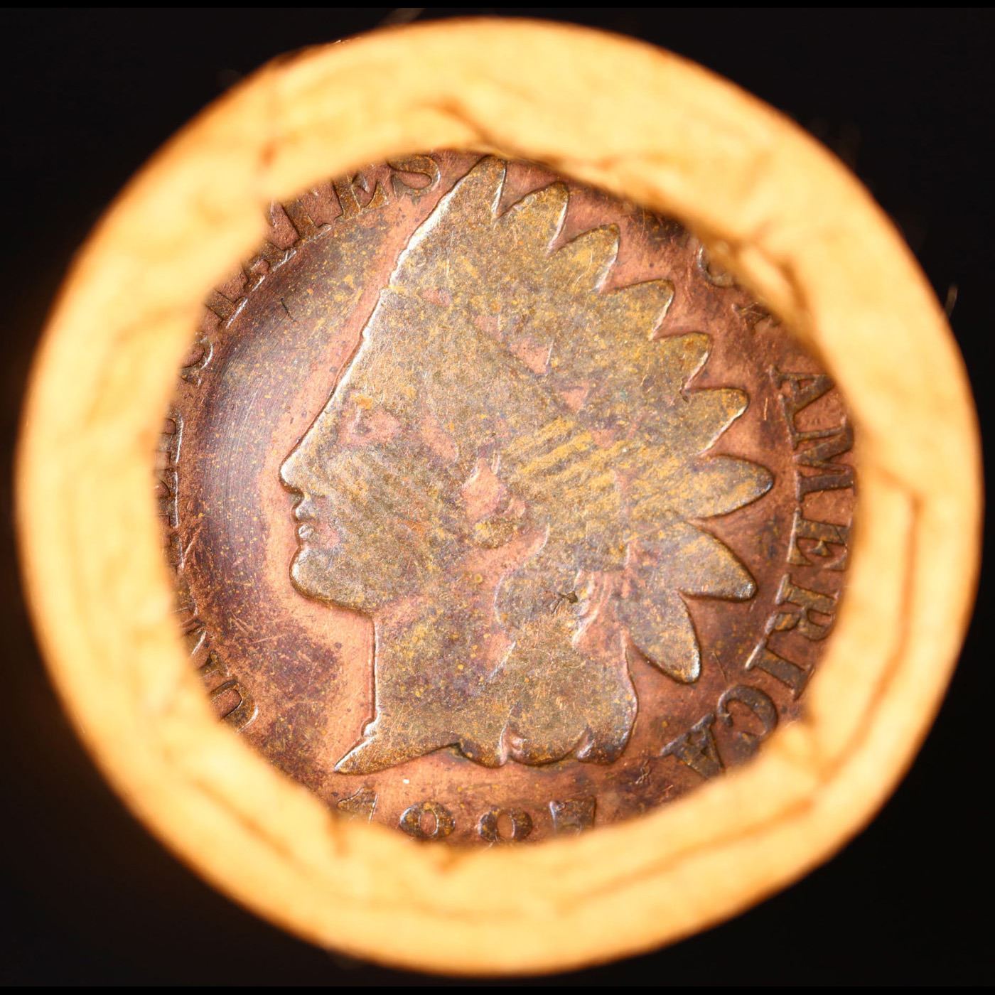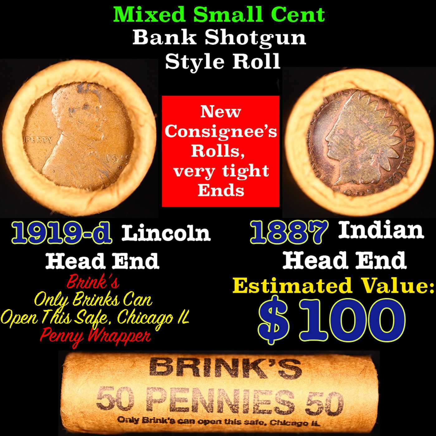 Mixed small cents 1c orig shotgun roll, 1919-d Wheat Cent, 1887 Indian Cent other end, brinks Wrappe
