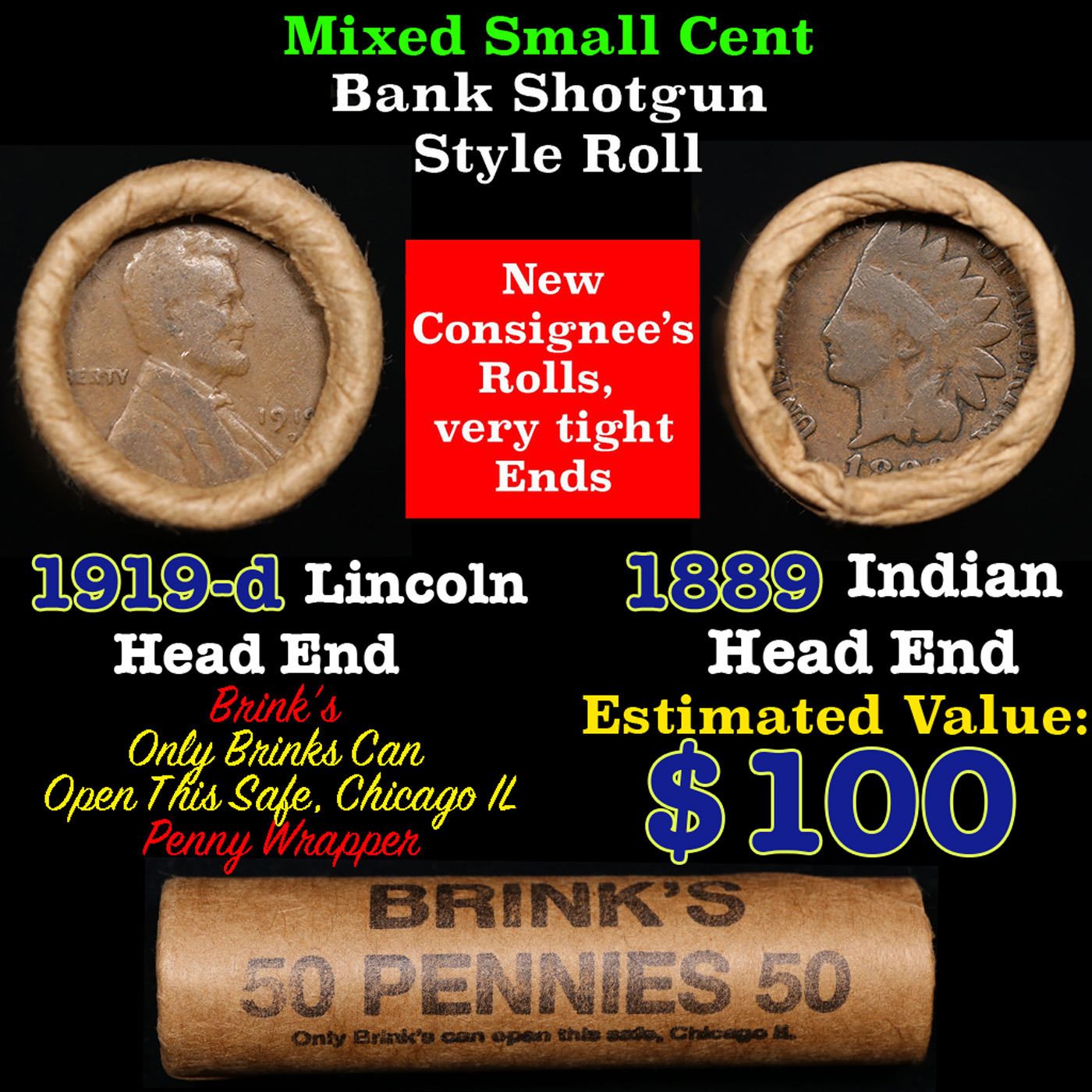 Mixed small cents 1c orig shotgun roll, 1919-d Wheat Cent, 1889 Indian Cent other end, Brinks Wrapper.. The roll is held in an old Rare & Collectable Brinks 'Only Brinks Can Open This Safe, Chicago IL' Penny wrapper. Actual roll pictured is the roll you will get. A great original bank shotgun roll with very tight ends. We have opened a few of these rolls. They seem to be mixed small cents including Indians, Wheats, Steel cents & some Flying Eagles mixed in. These shotgun rolls are all from a new consignee. They are all frrom one Estate.
