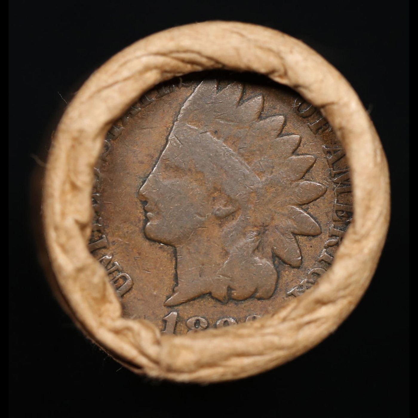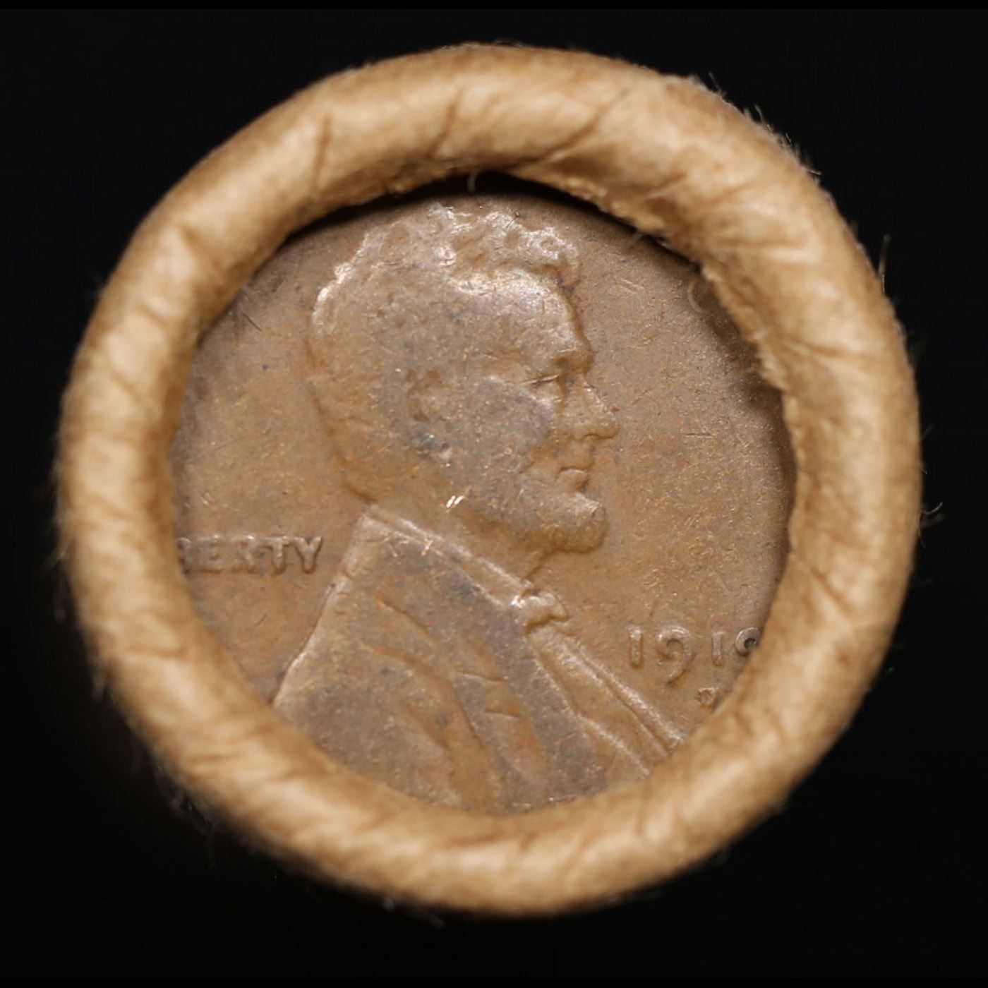 Mixed small cents 1c orig shotgun roll, 1919-d Wheat Cent, 1889 Indian Cent other end, Brinks Wrappe