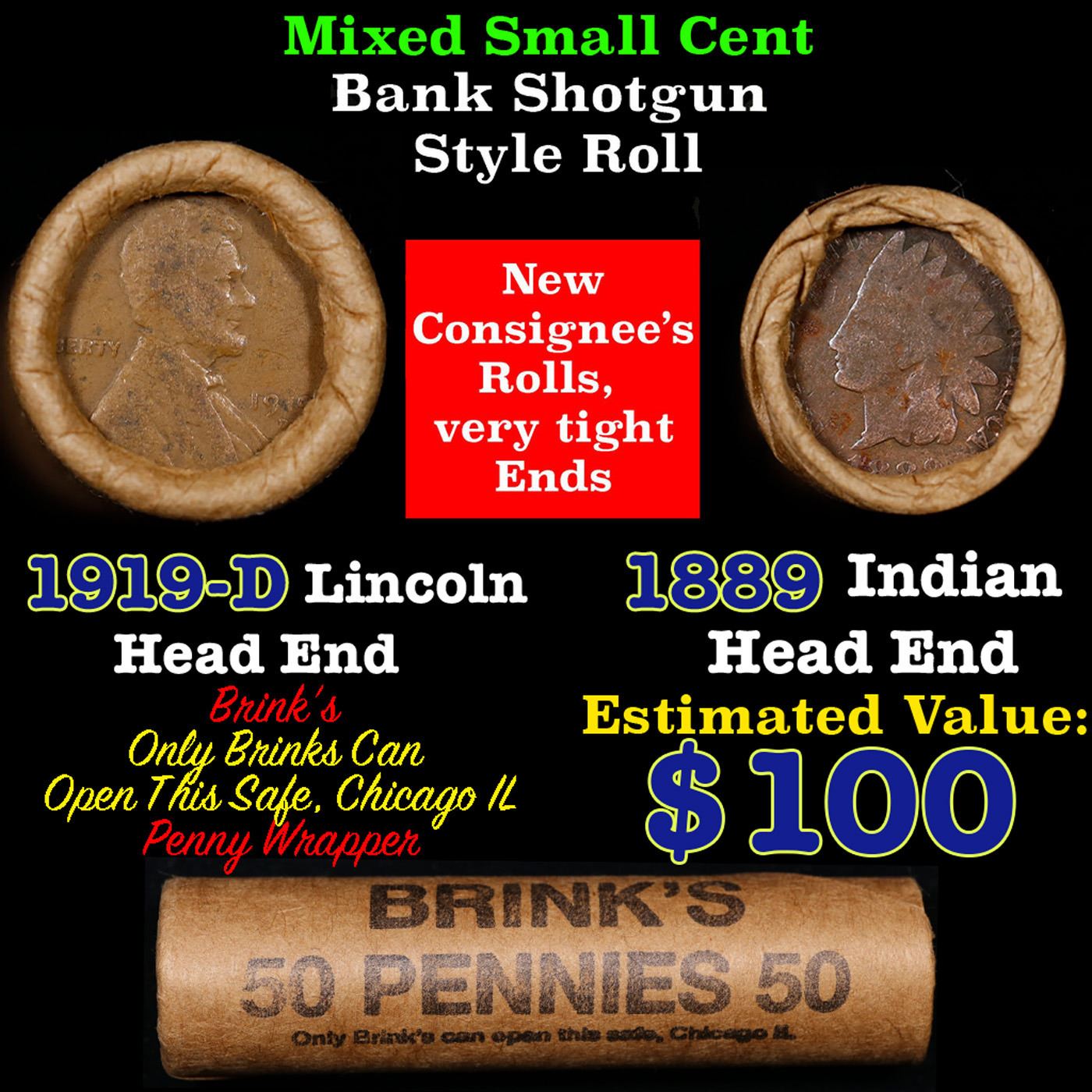 Mixed small cents 1c orig shotgun roll, 1919-d Wheat Cent, 1889 Indian Cent other end, Brinks Wrapper. The roll is held in an old Rare & Collectable Brinks Wrapper. Actual roll pictured is the roll you will get. A great original bank shotgun roll with very tight ends. We have opened a few of these rolls. They seem to be mixed small cents including Indians, Wheats, Steel cents & some Flying Eagles mixed in. These shotgun rolls are all from a new consignee. They are all frrom one Estate.