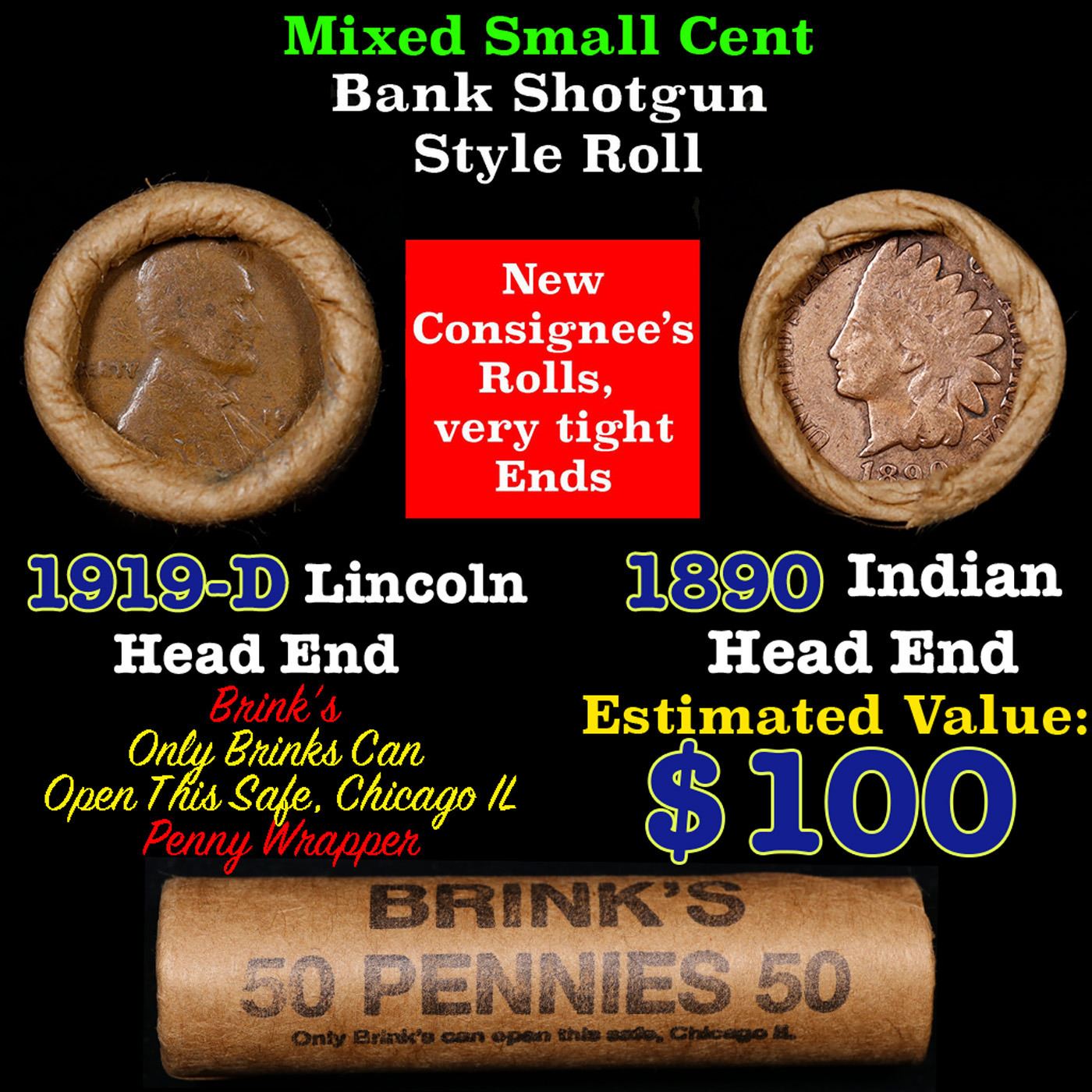Mixed small cents 1c orig shotgun roll, 1919-d Wheat Cent, 1890 Indian Cent other end, Brinks Wrapper. The roll is held in an old Rare & Collectable Brinks Wrapper. Actual roll pictured is the roll you will get. A great original bank shotgun roll with very tight ends. We have opened a few of these rolls. They seem to be mixed small cents including Indians, Wheats, Steel cents & some Flying Eagles mixed in. These shotgun rolls are all from a new consignee. They are all frrom one Estate.
