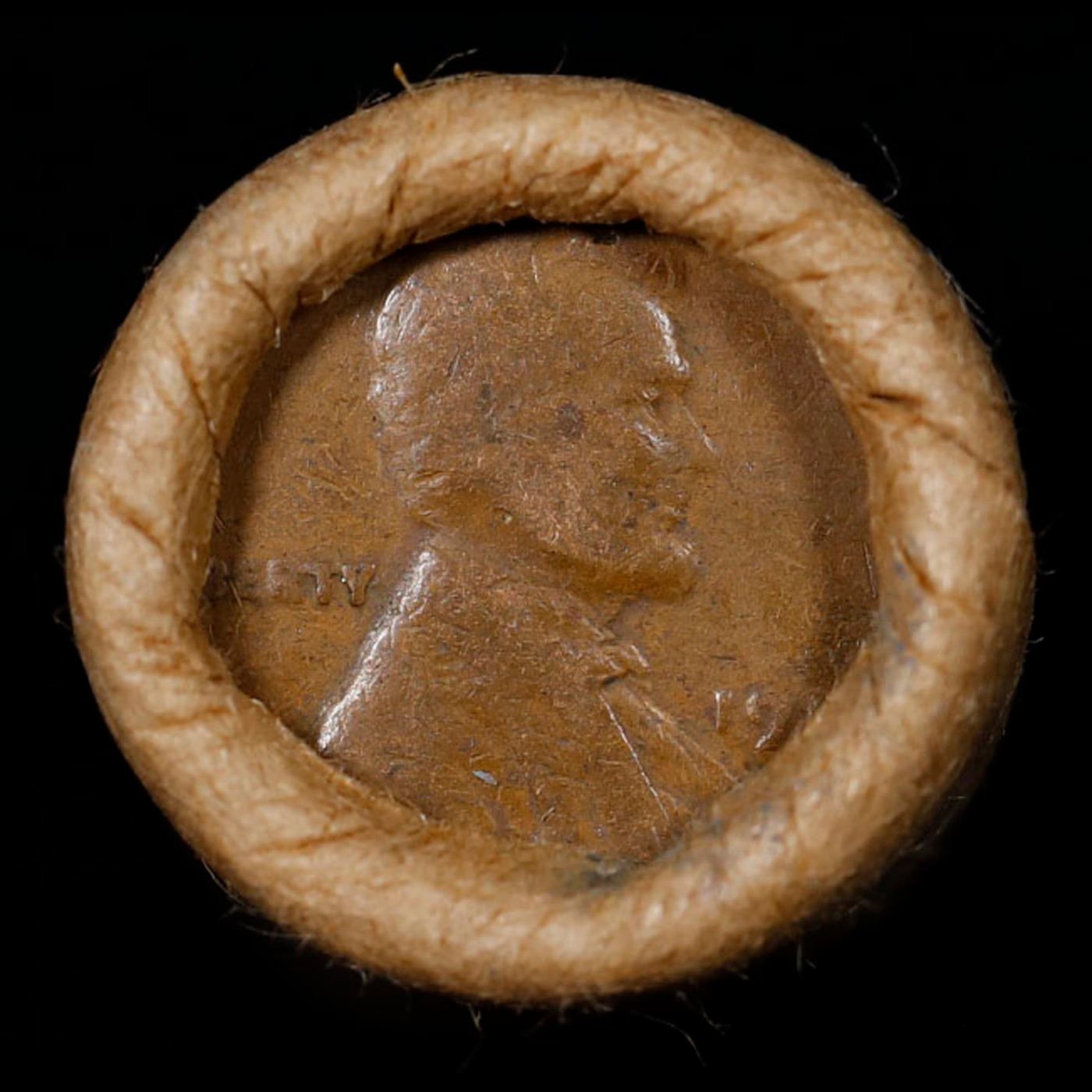 Mixed small cents 1c orig shotgun roll, 1919-d Wheat Cent, 1890 Indian Cent other end, Brinks Wrappe