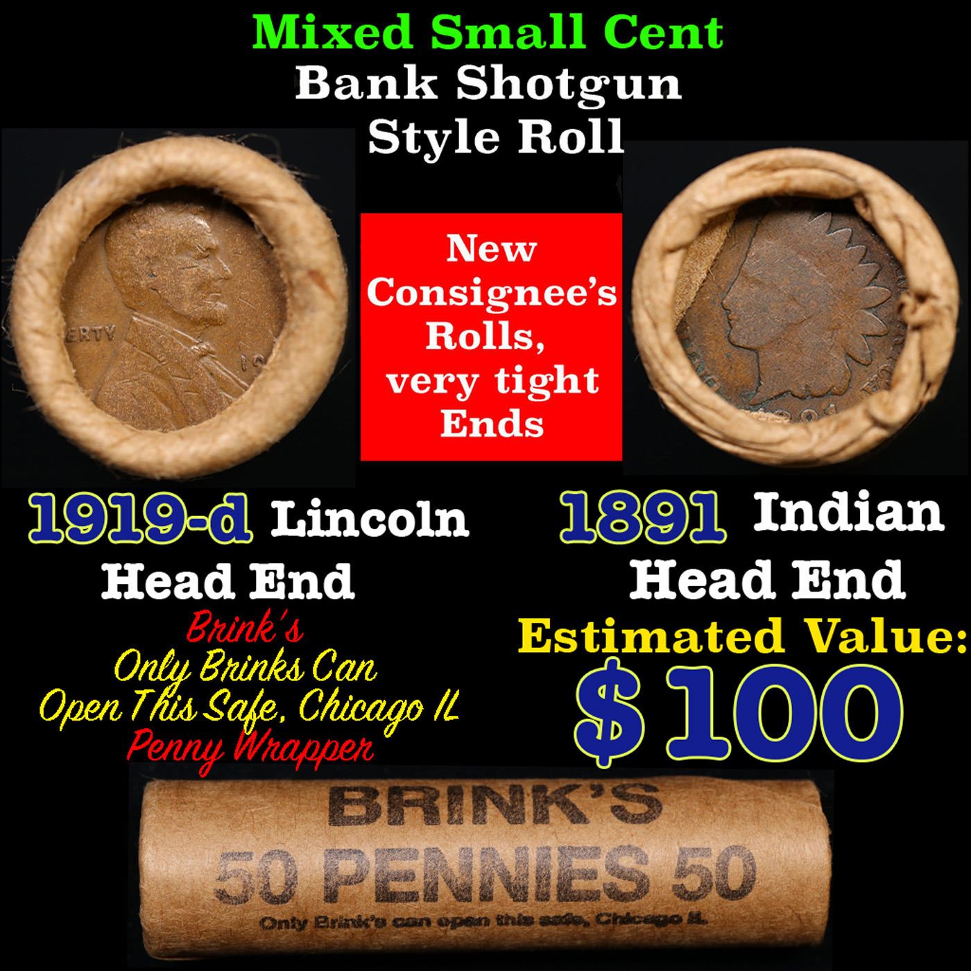 Mixed small cents 1c orig shotgun roll, 1919-d Wheat Cent, 1891 Indian Cent other end, Brinks Wrapper.. The roll is held in an old Rare & Collectable Brinks 'Only Brinks Can Open This Safe, Chicago IL' Penny wrapper. Actual roll pictured is the roll you will get. A great original bank shotgun roll with very tight ends. We have opened a few of these rolls. They seem to be mixed small cents including Indians, Wheats, Steel cents & some Flying Eagles mixed in. These shotgun rolls are all from a new consignee. They are all frrom one Estate.