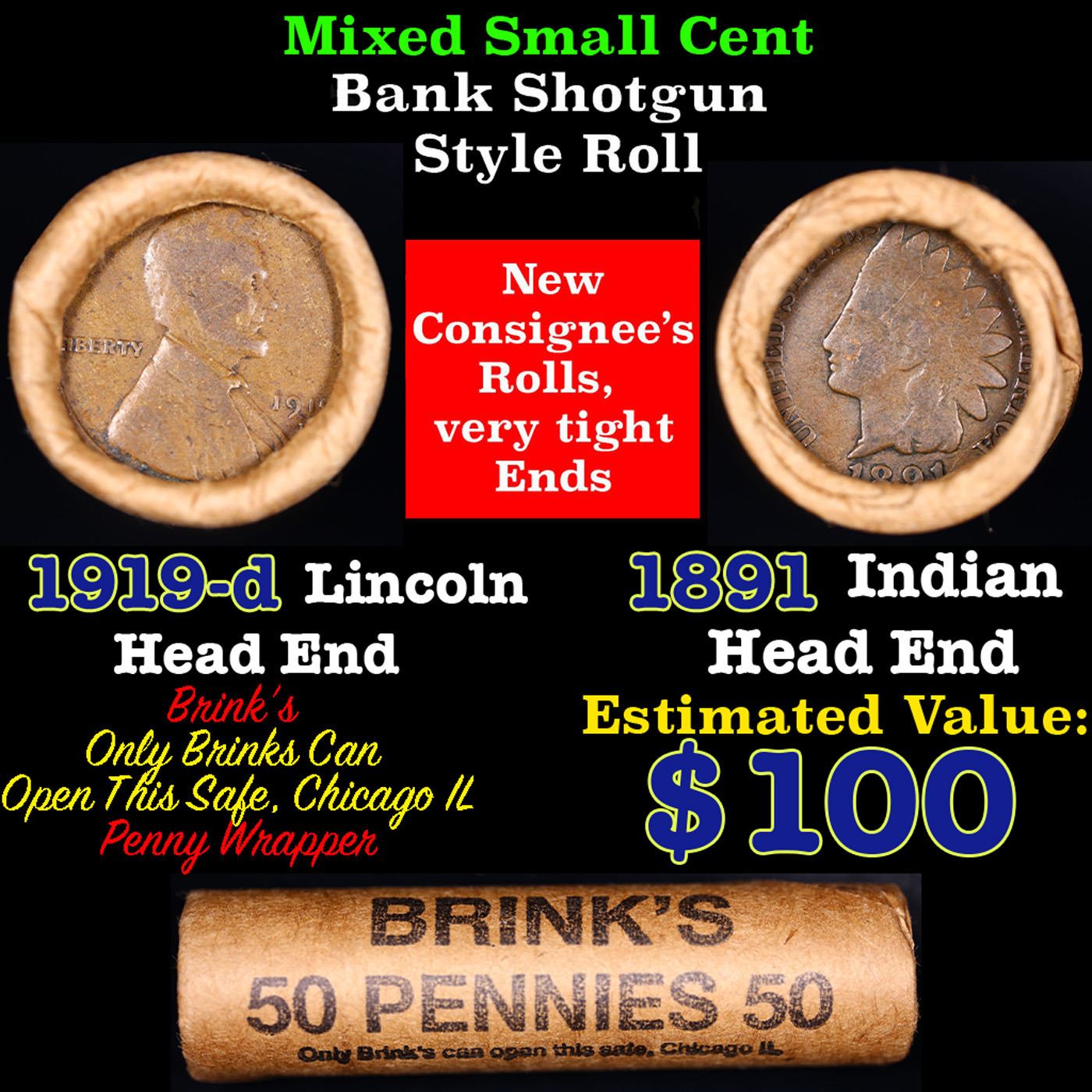 Mixed small cents 1c orig shotgun roll, 1919-d Wheat Cent, 1891 Indian Cent other end, brinks Wrapper. The roll is held in an old Rare & Collectable Brinks 'Only Brinks Can Open This Safe, Chicago IL' Penny wrapper. Actual roll pictured is the roll you will get. A great original bank shotgun roll with very tight ends. We have opened a few of these rolls. They seem to be mixed small cents including Indians, Wheats, Steel cents & some Flying Eagles mixed in. These shotgun rolls are all from a new consignee. They are all frrom one Estate.