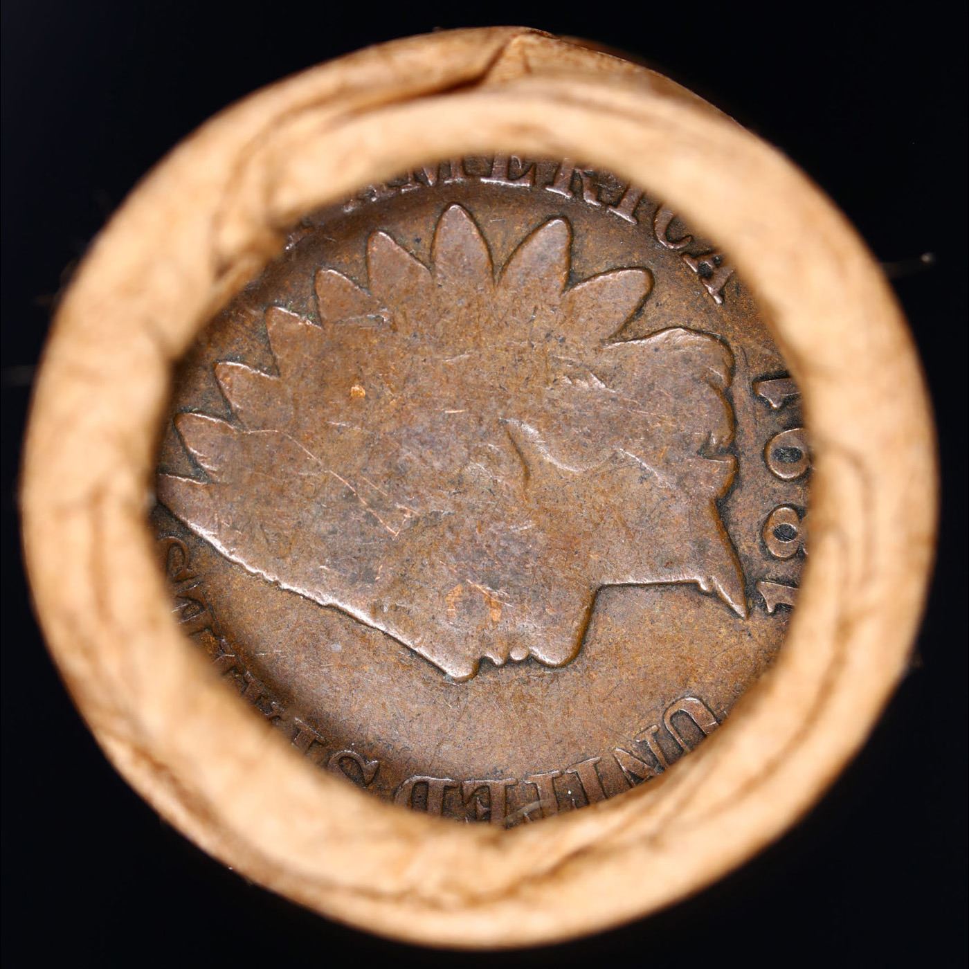 Mixed small cents 1c orig shotgun roll, 1919-d Wheat Cent, 1891 Indian Cent other end, brinks Wrappe