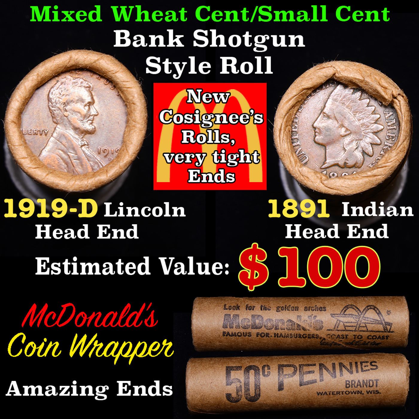 Mixed small cents 1c orig shotgun roll, 1919-d Wheat Cent, 1891 Indian cent other end, McDonalds Wra