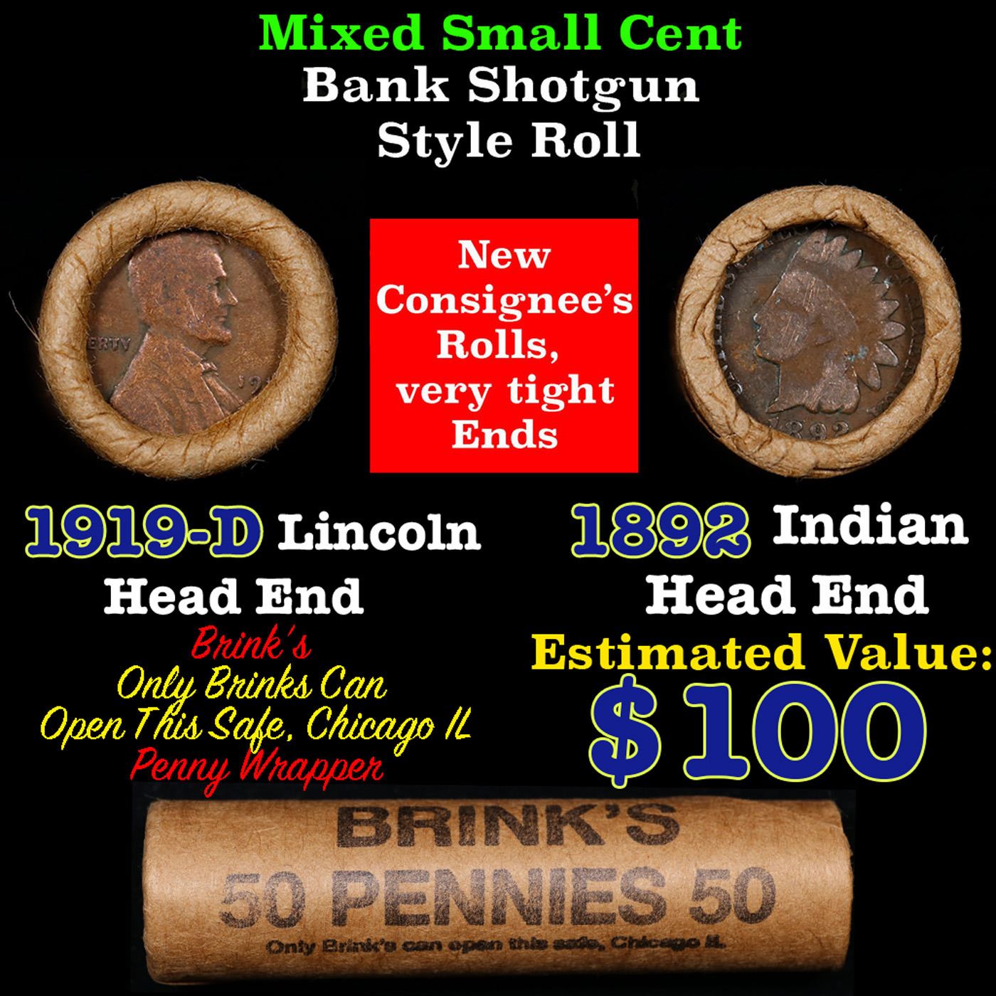 Mixed small cents 1c orig shotgun roll, 1919-d Wheat Cent, 1892 Indian Cent other end, Brinks Wrapper. The roll is held in an old Rare & Collectable Brinks Wrapper. Actual roll pictured is the roll you will get. A great original bank shotgun roll with very tight ends. We have opened a few of these rolls. They seem to be mixed small cents including Indians, Wheats, Steel cents & some Flying Eagles mixed in. These shotgun rolls are all from a new consignee. They are all frrom one Estate.