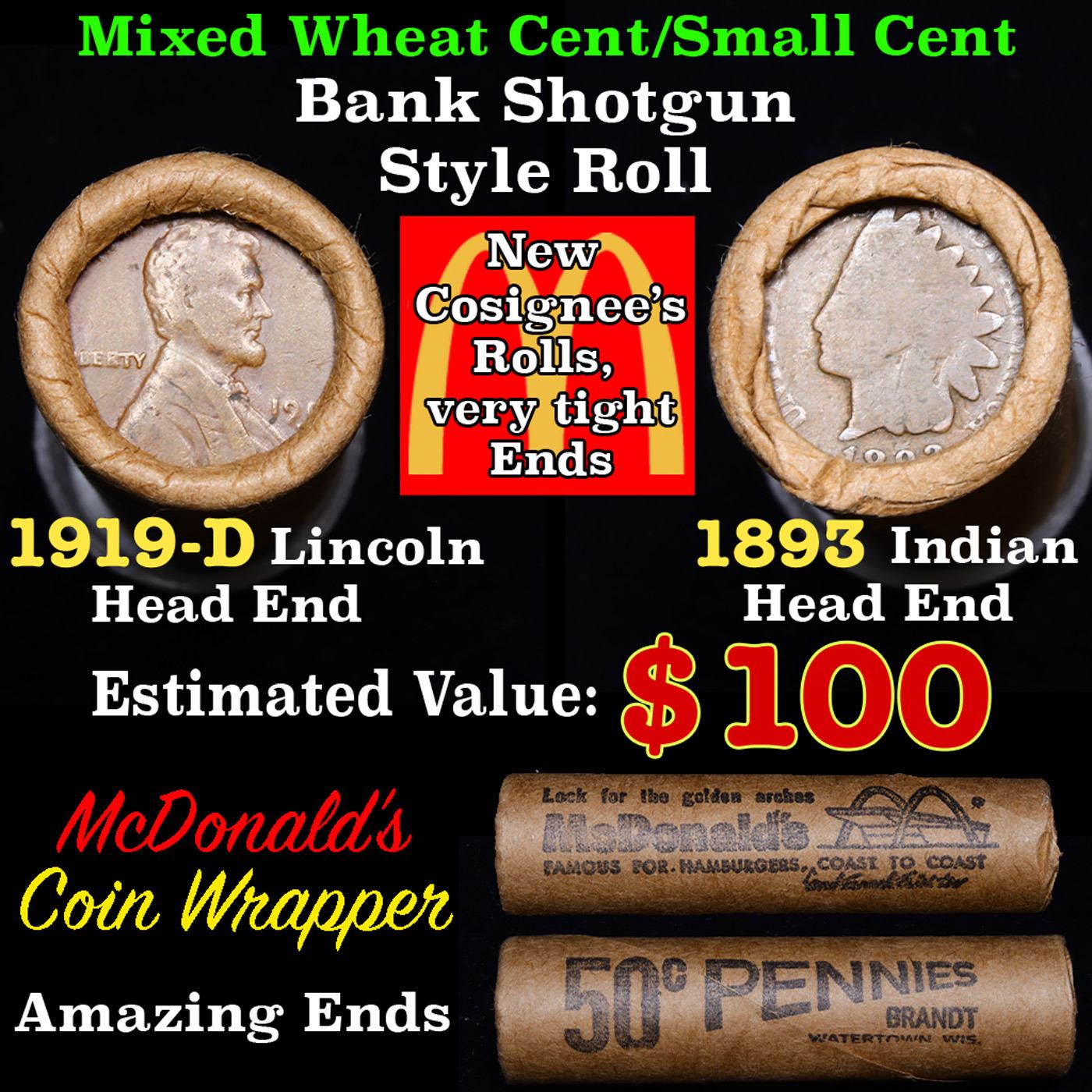 Mixed small cents 1c orig shotgun roll, 1919-d Wheat Cent, 1893 Indian Cent other end, McDonalds Wra