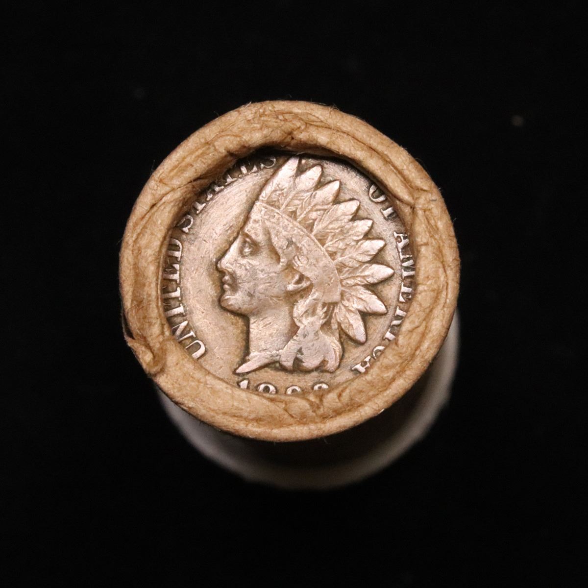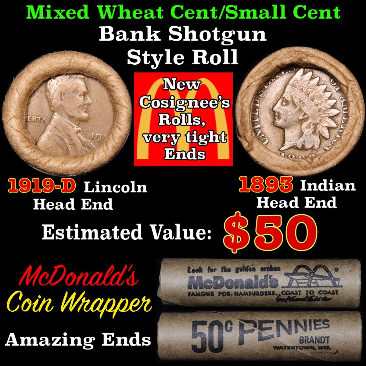 Mixed small cents 1c orig shotgun roll, 1919-d Wheat Cent, 1893 Indian Cent other end. The roll is held in an old Rare & Collectable McDonalds Brandt wrapper. Actual roll pictured is the roll you will get. A great original bank shotgun roll with very tight ends. We have opened a few of these rolls. They seem to be mixed small cents including Indians, Wheats, Steel cents & some Flying Eagles mixed in. These shotgun rolls are all from a new consignee. They are all frrom one Estate.