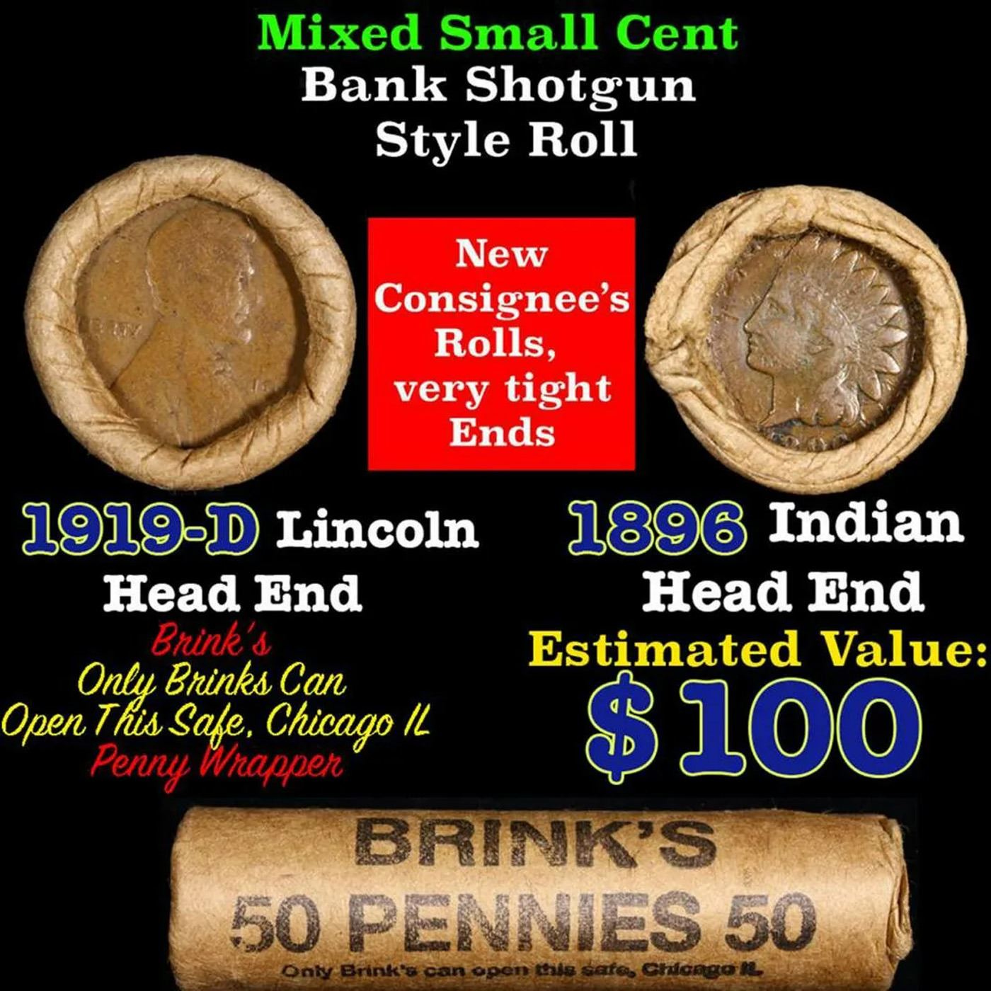 Mixed small cents 1c orig shotgun roll, 1919-d Wheat Cent, 1896 Indian Cent other end, Brinks Wrapper.. The roll is held in an old Rare & Collectable Brinks 'Only Brinks Can Open This Safe, Chicago IL' Penny wrapper. Actual roll pictured is the roll you will get. A great original bank shotgun roll with very tight ends. We have opened a few of these rolls. They seem to be mixed small cents including Indians, Wheats, Steel cents & some Flying Eagles mixed in. These shotgun rolls are all from a new consignee. They are all frrom one Estate.