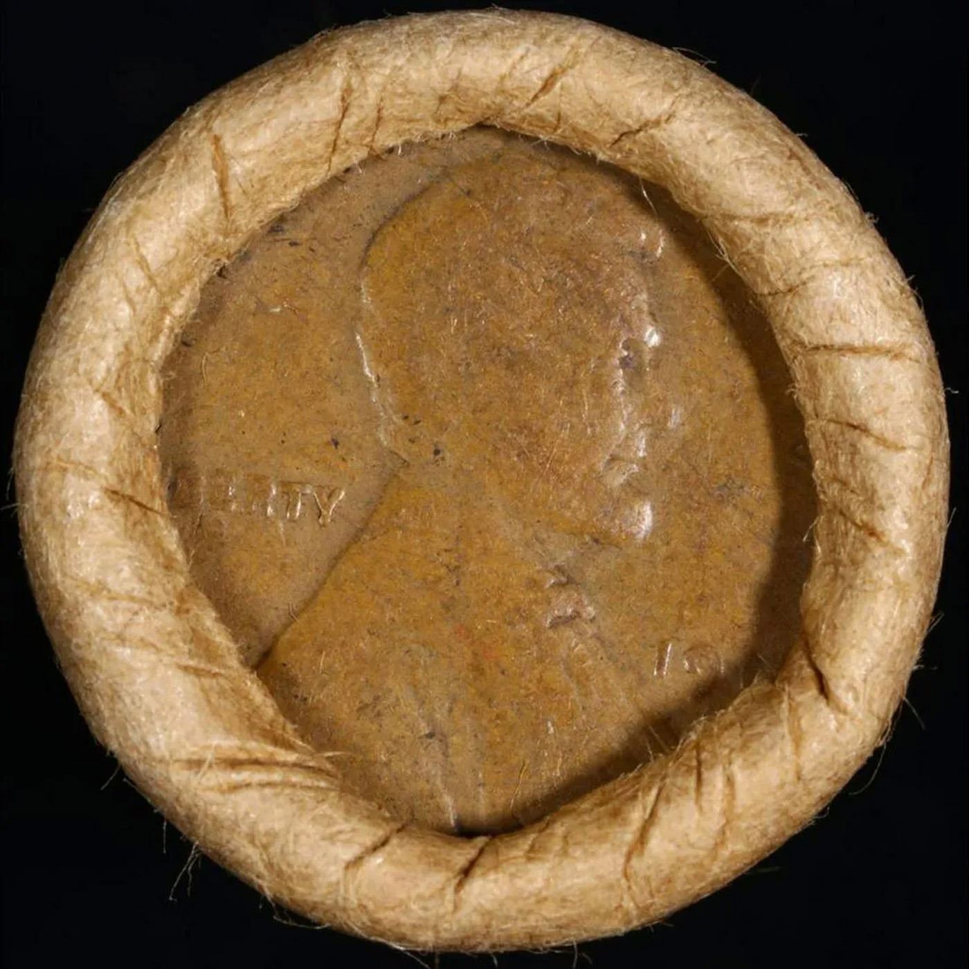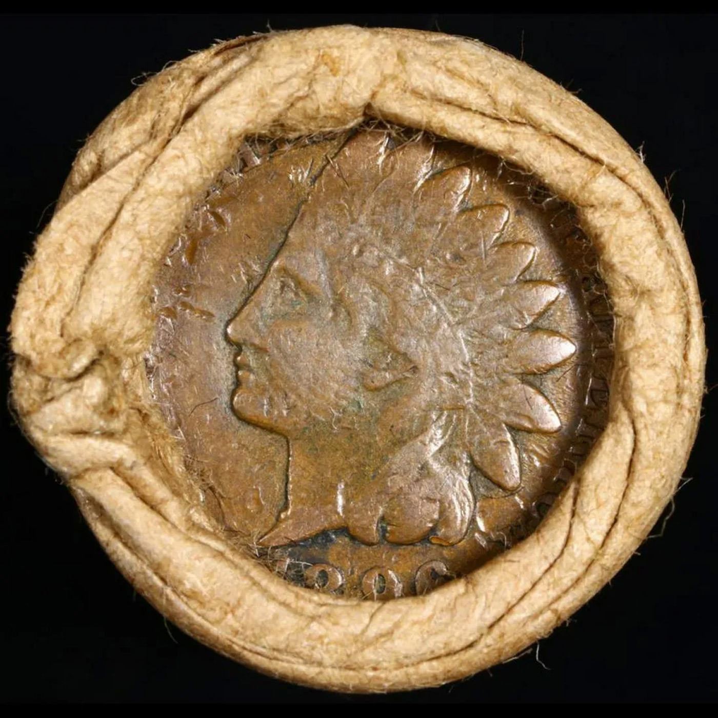 Mixed small cents 1c orig shotgun roll, 1919-d Wheat Cent, 1896 Indian Cent other end, Brinks Wrappe