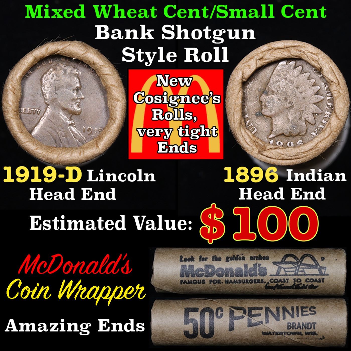 Mixed small cents 1c orig shotgun roll, 1919-d Wheat Cent, 1896 Indian Cent other end, McDonalds Wrapper. The roll is held in an old Rare & Collectable McDonalds Brandt wrapper. Look For The Golden Arches. Actual roll pictured is the roll you will get. A great original bank shotgun roll with very tight ends. We have opened a few of these rolls. They seem to be mixed small cents including Indians, Wheats, Steel cents & some Flying Eagles mixed in. These shotgun rolls are all from a new consignee. They are all from one Estate.