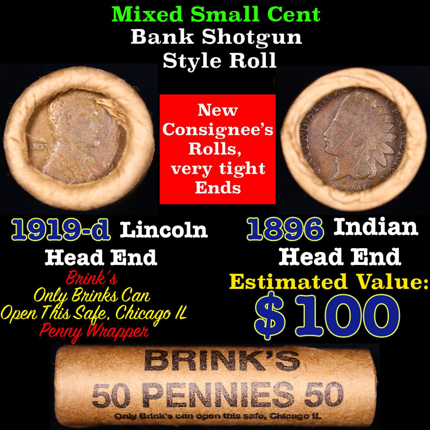 Mixed small cents 1c orig shotgun roll, 1919-d Wheat Cent, 1896 Indian Cent other end, brinks Wrapper. The roll is held in an old Rare & Collectable Brinks 'Only Brinks Can Open This Safe, Chicago IL' Penny wrapper. Actual roll pictured is the roll you will get. A great original bank shotgun roll with very tight ends. We have opened a few of these rolls. They seem to be mixed small cents including Indians, Wheats, Steel cents & some Flying Eagles mixed in. These shotgun rolls are all from a new consignee. They are all frrom one Estate.