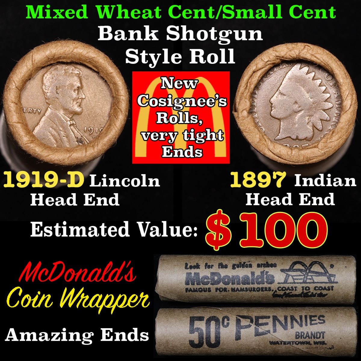 Mixed small cents 1c orig shotgun roll, 1919-d Wheat Cent, 1897 Indian Cent other end,McDnalds Wrapper. The roll is held in an old Rare & Collectable McDonalds Brandt wrapper. Look For The Golden Arches. Actual roll pictured is the roll you will get. A great original bank shotgun roll with very tight ends. We have opened a few of these rolls. They seem to be mixed small cents including Indians, Wheats, Steel cents & some Flying Eagles mixed in. These shotgun rolls are all from a new consignee. They are all frrom one Estate.