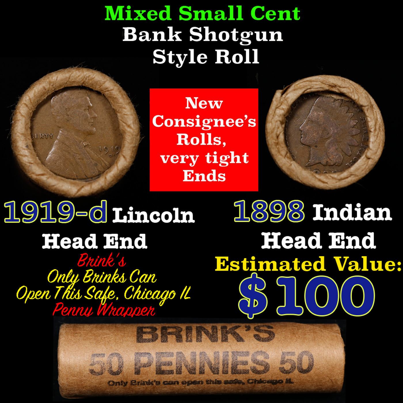 Mixed small cents 1c orig shotgun roll, 1919-d Wheat Cent, 1898 Indian Cent other end, Brinks Wrapper.. The roll is held in an old Rare & Collectable Brinks 'Only Brinks Can Open This Safe, Chicago IL' Penny wrapper. Actual roll pictured is the roll you will get. A great original bank shotgun roll with very tight ends. We have opened a few of these rolls. They seem to be mixed small cents including Indians, Wheats, Steel cents & some Flying Eagles mixed in. These shotgun rolls are all from a new consignee. They are all frrom one Estate.