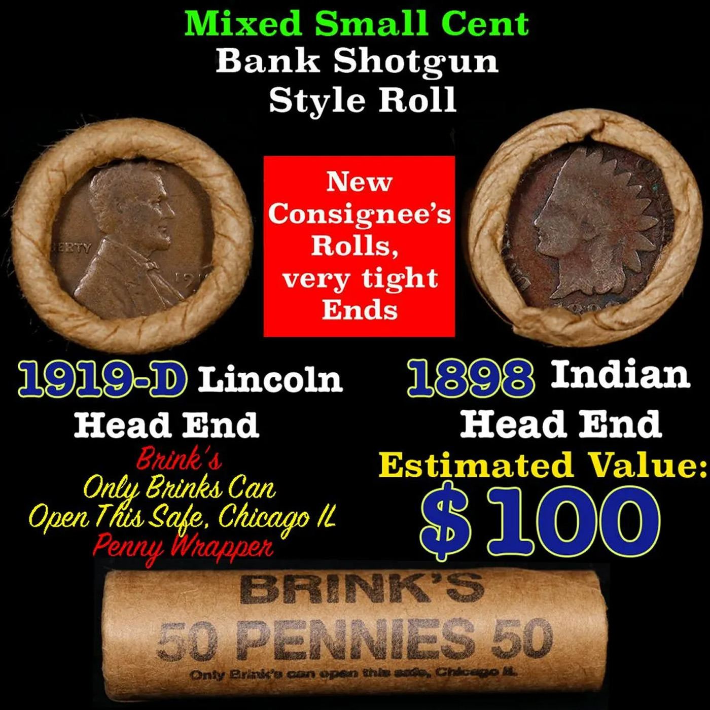 Mixed small cents 1c orig shotgun roll, 1919-d Wheat Cent, 1898 Indian Cent other end, Brinks Wrapper.. The roll is held in an old Rare & Collectable Brinks 'Only Brinks Can Open This Safe, Chicago IL' Penny wrapper. Actual roll pictured is the roll you will get. A great original bank shotgun roll with very tight ends. We have opened a few of these rolls. They seem to be mixed small cents including Indians, Wheats, Steel cents & some Flying Eagles mixed in. These shotgun rolls are all from a new consignee. They are all frrom one Estate.