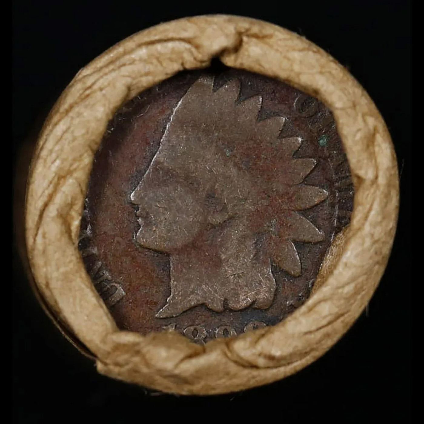 Mixed small cents 1c orig shotgun roll, 1919-d Wheat Cent, 1898 Indian Cent other end, Brinks Wrappe