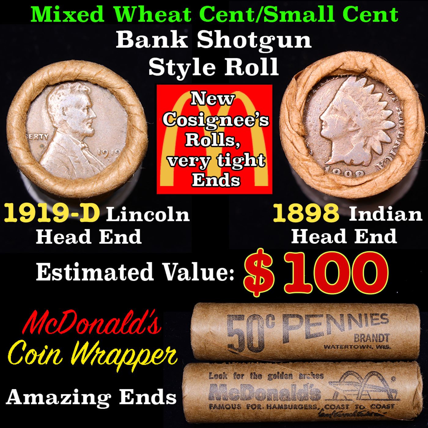 Mixed small cents 1c orig shotgun roll, 1919-d Wheat Cent, 1898 Indian Cent other end, McDonalds Wra