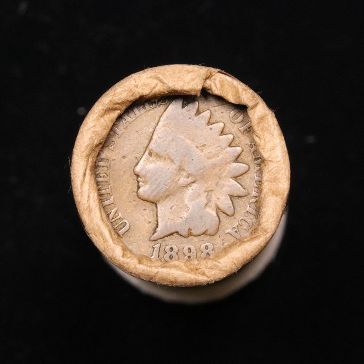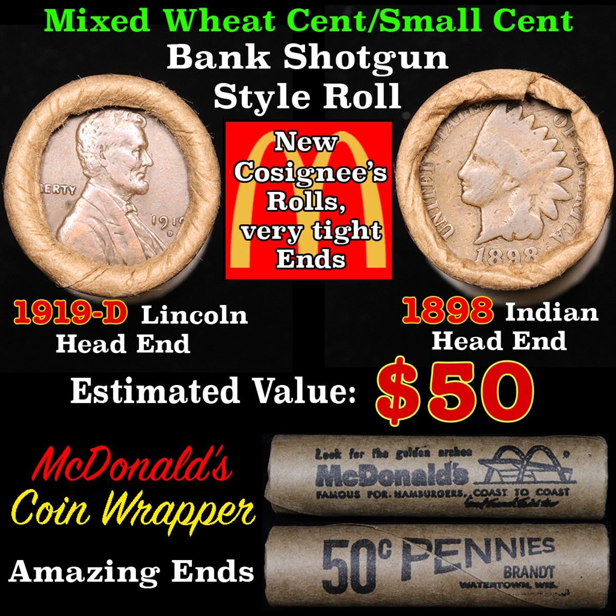 Mixed small cents 1c orig shotgun roll, 1919-d Wheat Cent, 1898 Indian Cent other end. The roll is held in an old Rare & Collectable McDonalds Brandt wrapper. Actual roll pictured is the roll you will get. A great original bank shotgun roll with very tight ends. We have opened a few of these rolls. They seem to be mixed small cents including Indians, Wheats, Steel cents & some Flying Eagles mixed in. These shotgun rolls are all from a new consignee. They are all frrom one Estate.