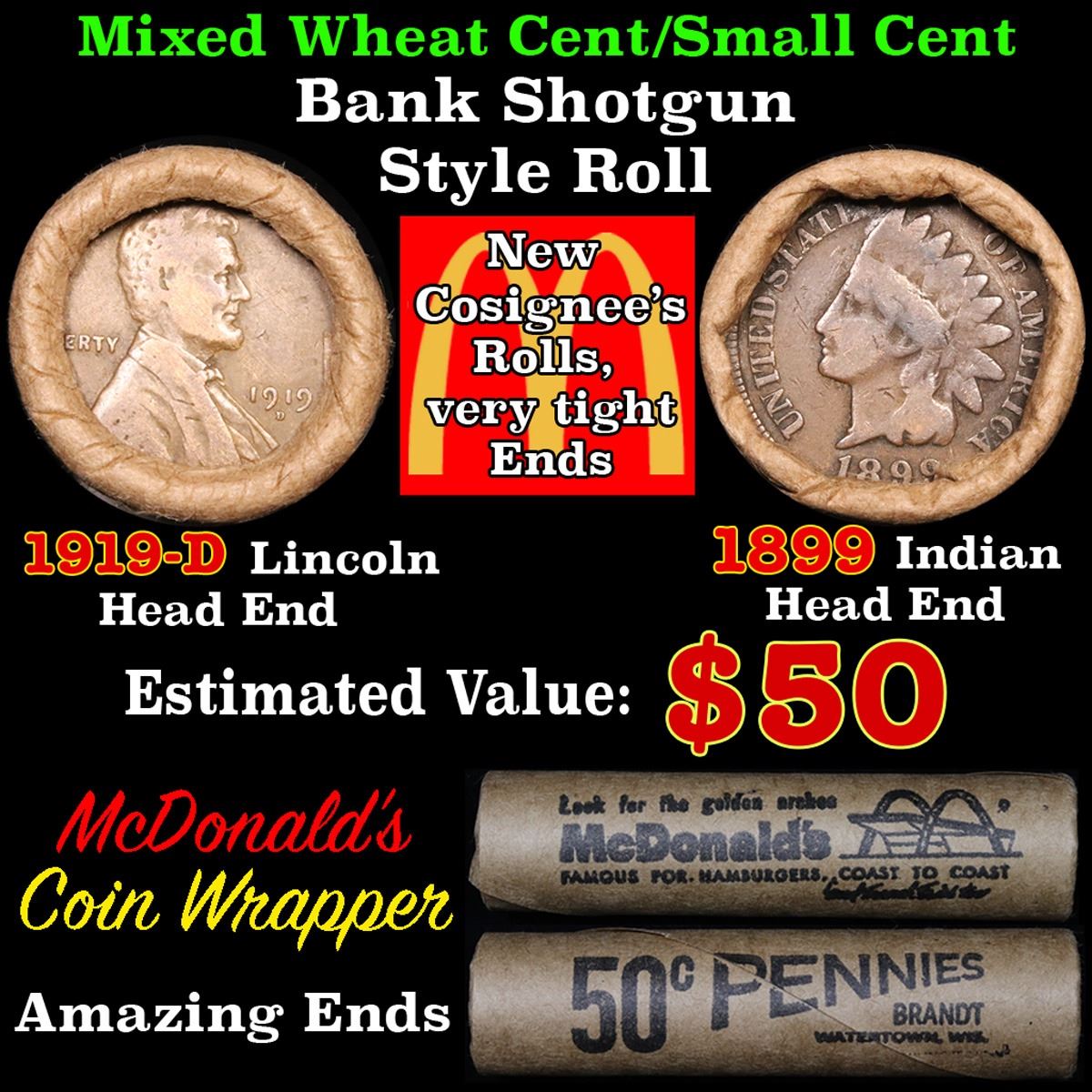 Mixed small cents 1c orig shotgun roll, 1919-d Wheat Cent, 1899 Indian Cent other end . .. The roll is held in an old Rare & Collectable McDonalds Brandt wrapper. Actual roll pictured is the roll you will get. A great original bank shotgun roll with very tight ends. We have opened a few of these rolls. They seem to be mixed small cents including Indians, Wheats, Steel cents & some Flying Eagles mixed in. These shotgun rolls are all from a new consignee. They are all frrom one Estate.