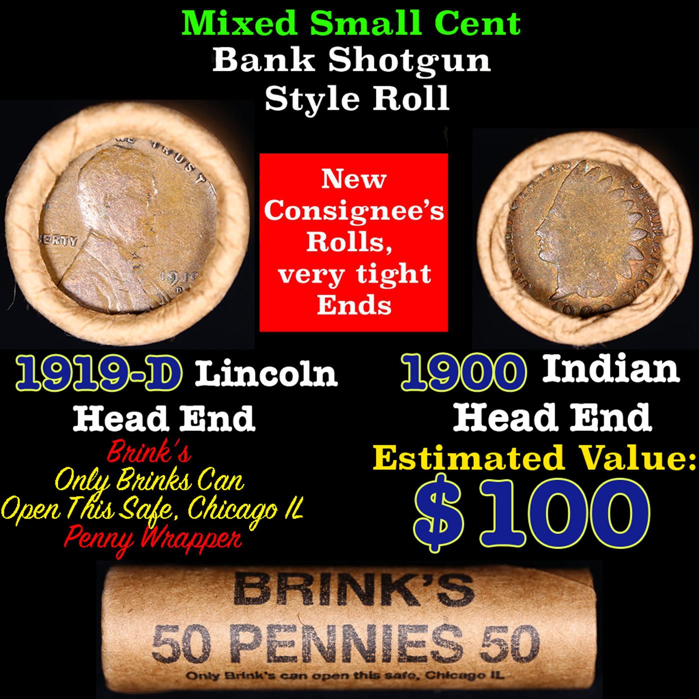 Mixed small cents 1c orig shotgun roll, 1919-d Wheat Cent, 1900 Indian Cent other end, brinks Wrapper. The roll is held in an old Rare & Collectable Brinks 'Only Brinks Can Open This Safe, Chicago IL' Penny wrapper. Actual roll pictured is the roll you will get. A great original bank shotgun roll with very tight ends. We have opened a few of these rolls. They seem to be mixed small cents including Indians, Wheats, Steel cents & some Flying Eagles mixed in. These shotgun rolls are all from a new consignee. They are all frrom one Estate.