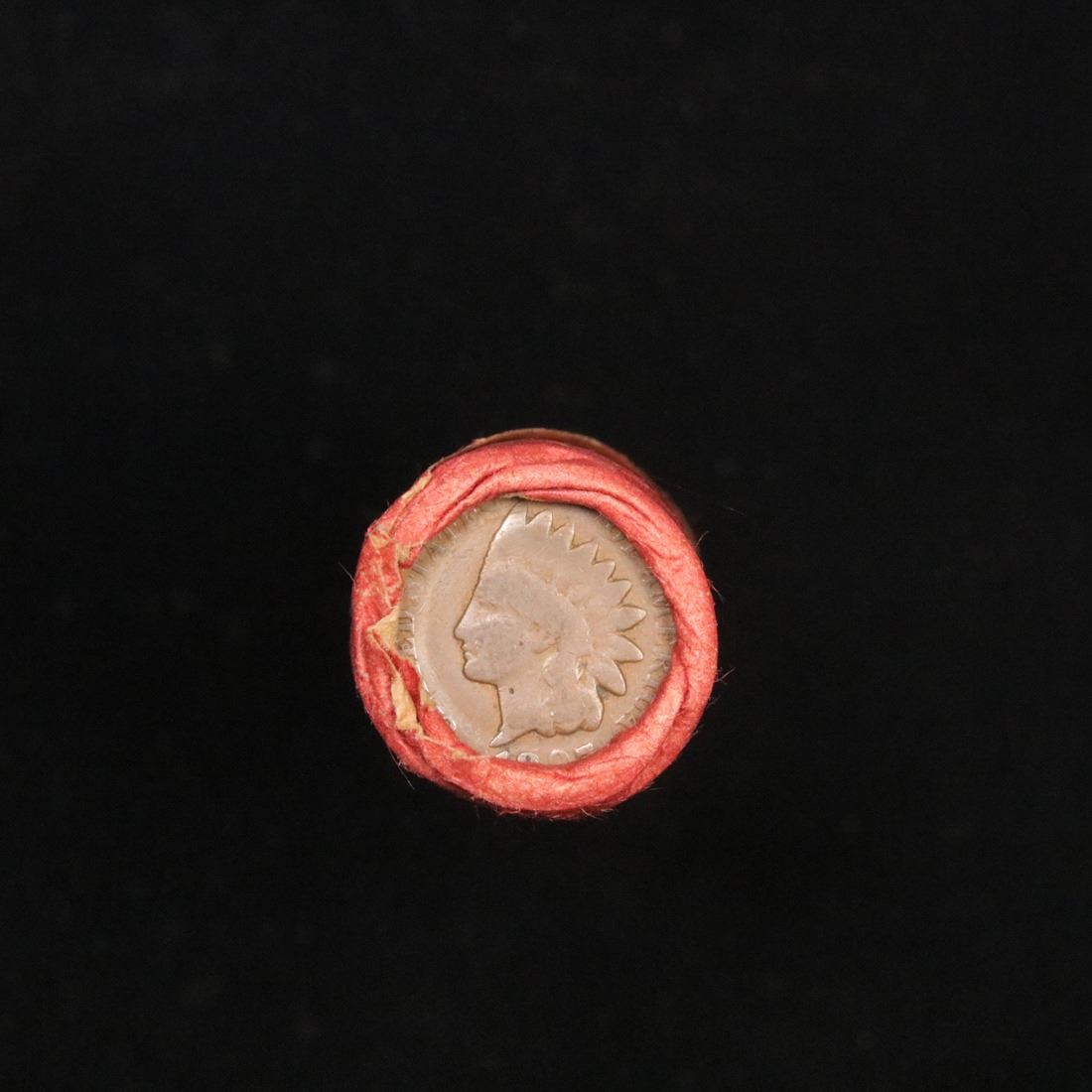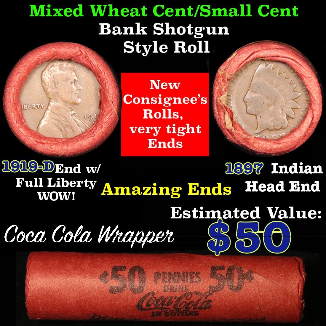 Mixed small cents 1c orig shotgun roll, 1919-d one end, 1897 Indian cent other end. The roll is held in an old, rare and collectible Coca-Cola wrapper. Actual roll pictured is the roll you will get. A great original bank shotgun roll with very tight ends. We have been getting excellent feedback on these rolls. Were being told that close to half the roll are teens, some with mintmarks, there are a few Indians in all the rolls, most of the rolls have steel cents. They seem to be PQ Wheaties rolls. These shotgun rolls are all from a new consignee. They are all frrom one Estate. This particular Roll shows a 1919-d on one end and an 1897 Indian on the other end.