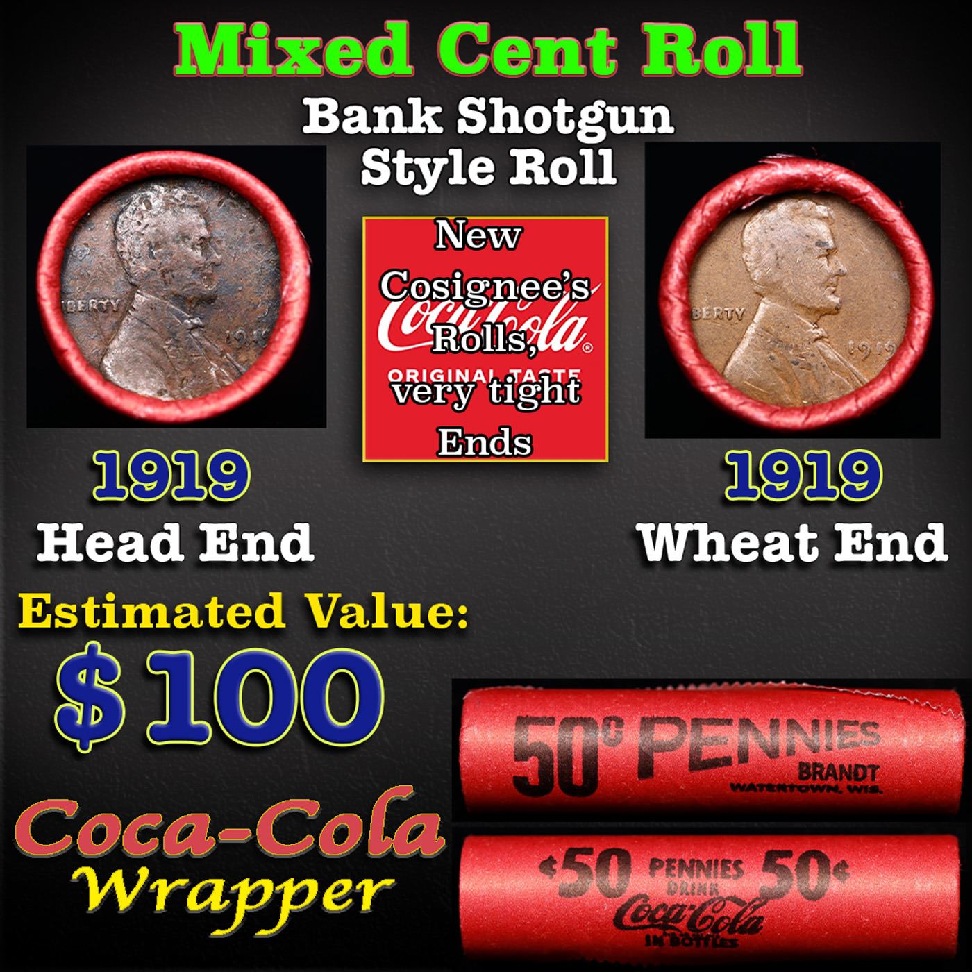 Mixed small cents 1c orig shotgun roll, 1919-p Lincoln Cent, 1919-p Wheat Cent other end, Coca Cola Wrapper. Actual roll pictured is the roll you will get. A Brandt wrapper stamped Coca-Cola. A great original bank shotgun roll with very tight ends. We have opened a few of these rolls. They seem to be mixed small cents including Indians, Wheats, Steel cents & some Flying Eagles mixed in. These shotgun rolls are all from a new consignee. They are all frrom one Estate.