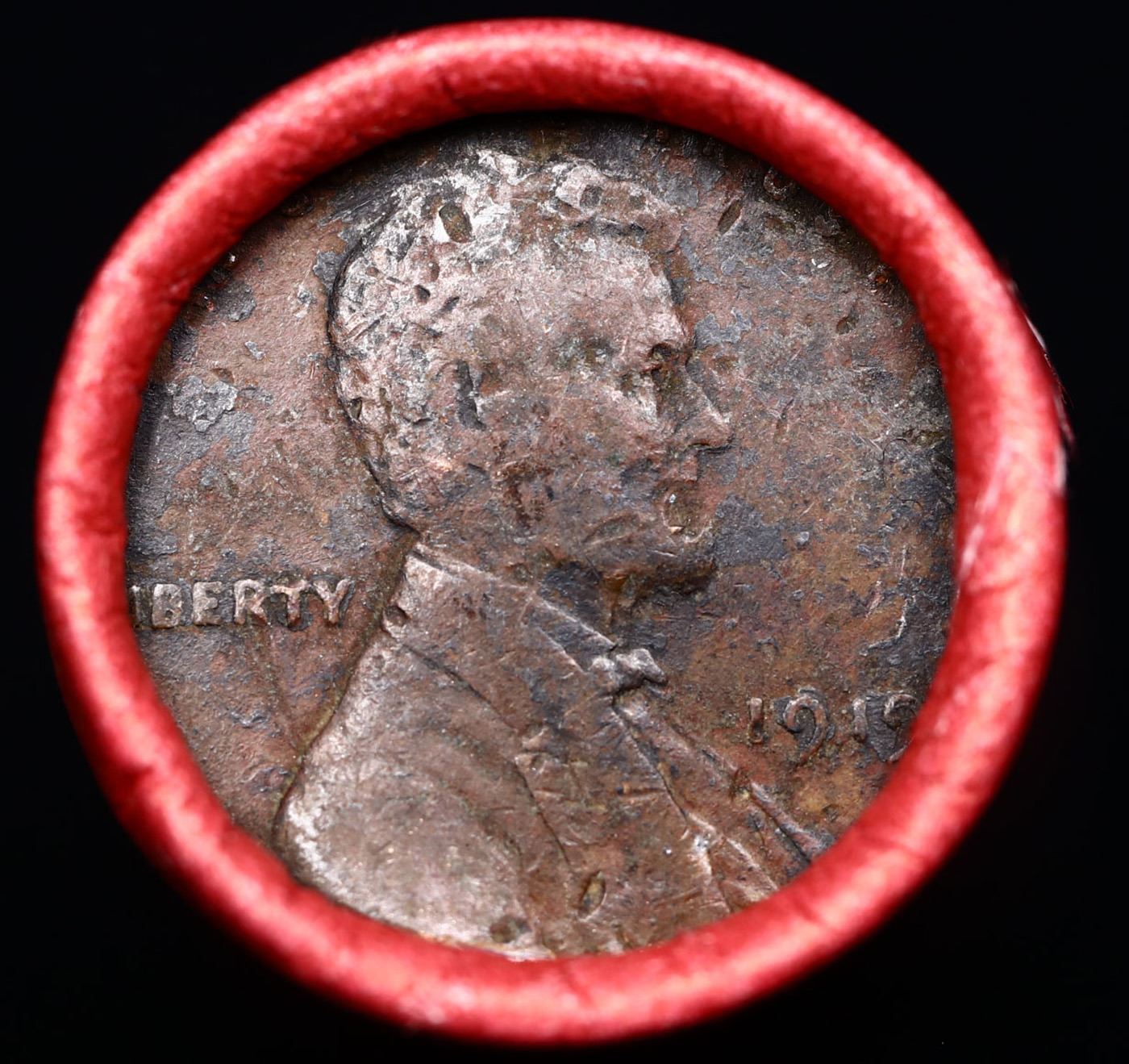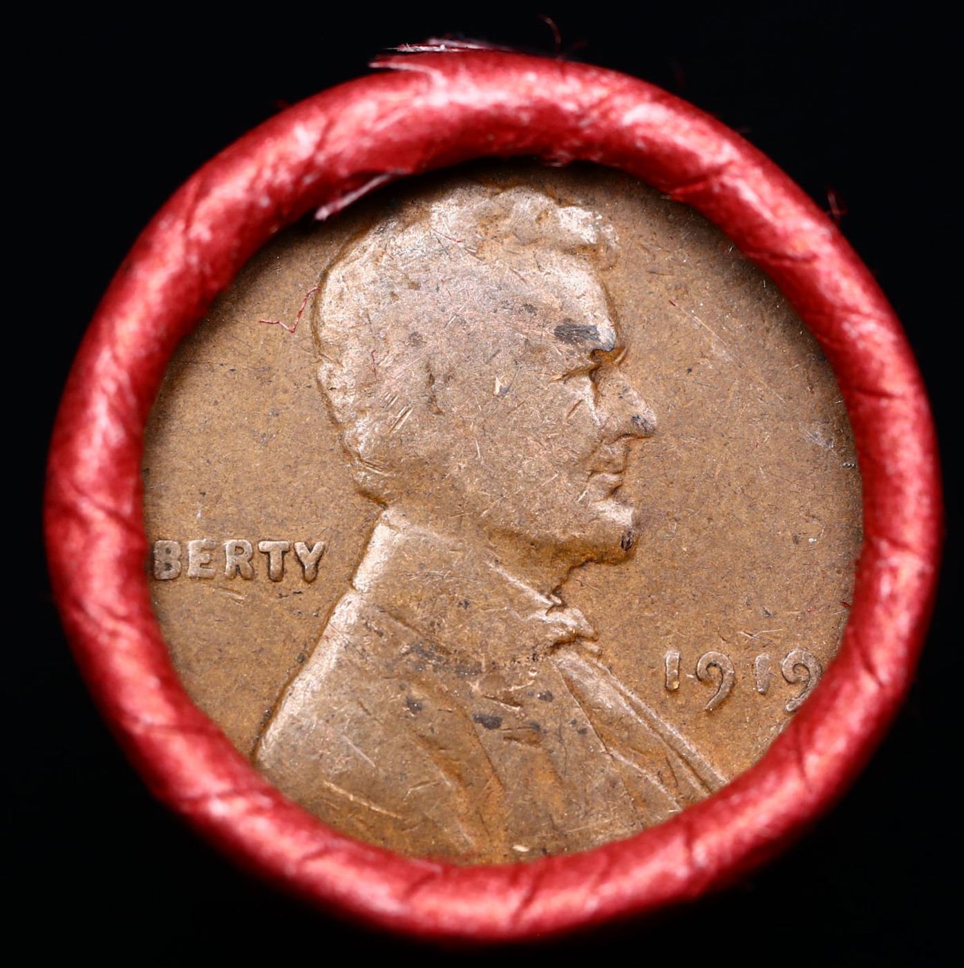 Mixed small cents 1c orig shotgun roll, 1919-p Lincoln Cent, 1919-p Wheat Cent other end, Coca Cola