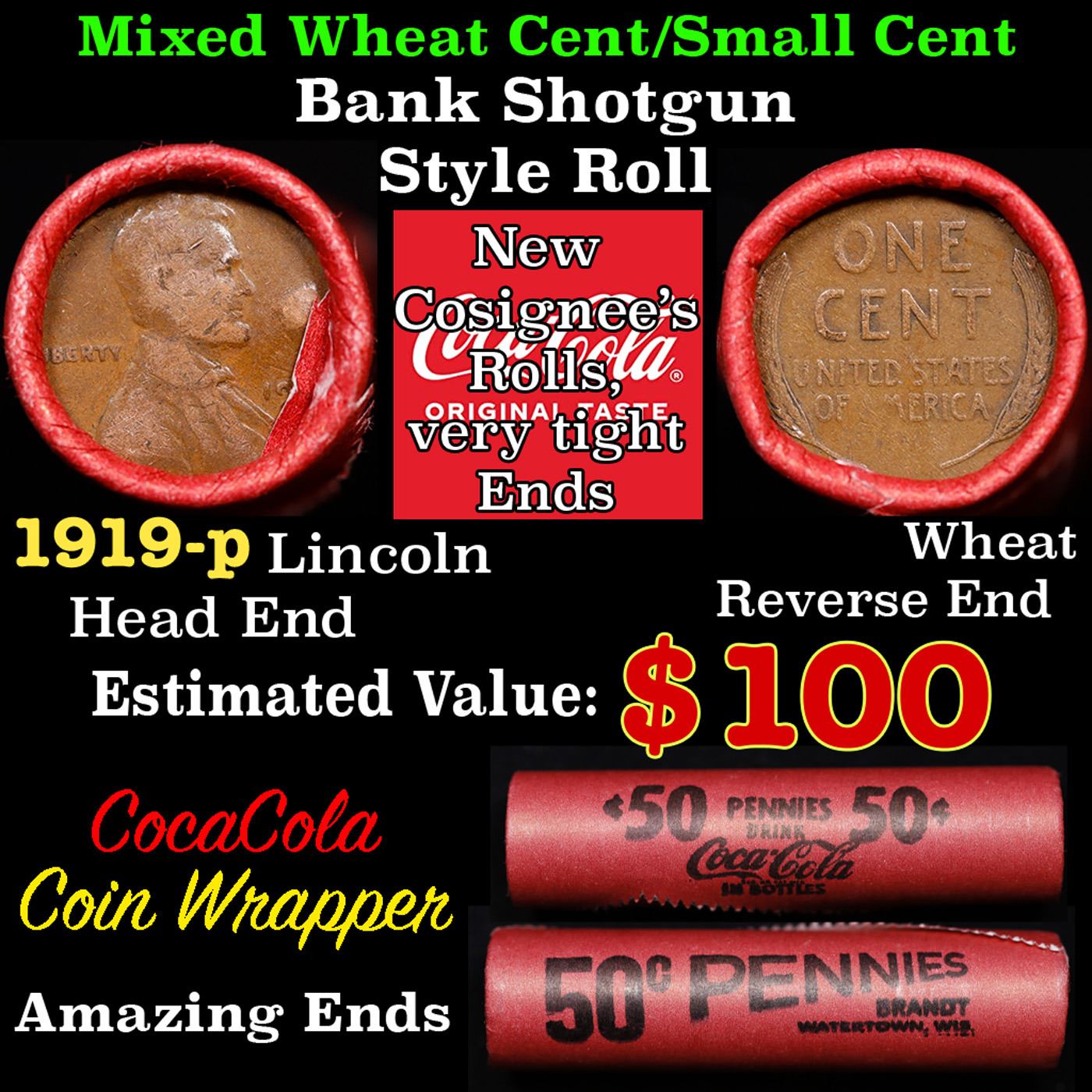 Mixed small cents 1c orig shotgun roll, 1919-p Lincoln Cent, Wheat Cent other end, Coca Cola Wrapper.. The roll is held in an old Rare & Collectable Brinks 'Only Brinks Can Open This Safe, Chicago IL' Penny wrapper. Actual roll pictured is the roll you will get. A great original bank shotgun roll with very tight ends. We have opened a few of these rolls. They seem to be mixed small cents including Indians, Wheats, Steel cents & some Flying Eagles mixed in. These shotgun rolls are all from a new consignee. They are all frrom one Estate.
