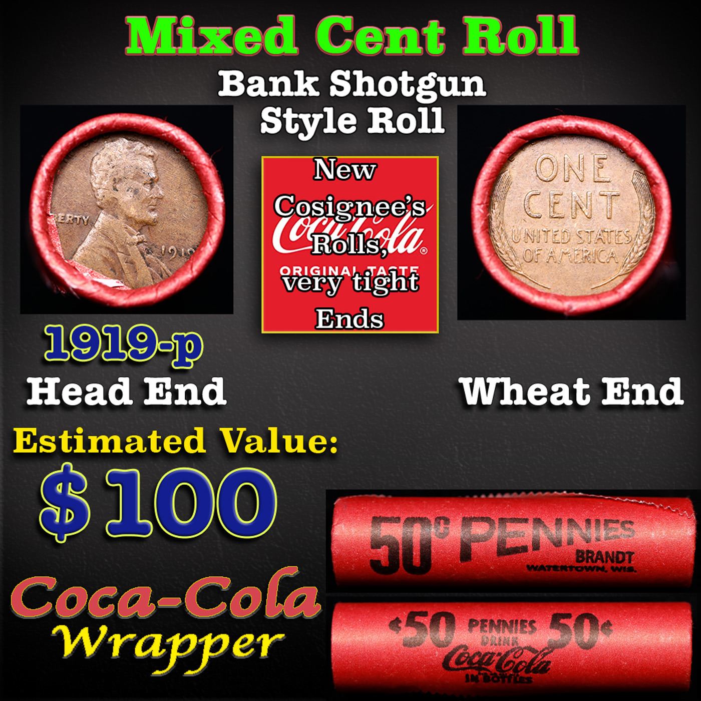 Mixed small cents 1c orig shotgun roll, 1919-p Lincoln Cent, wheat other end, Coca Cola Wrapper. Actual roll pictured is the roll you will get. A Brandt wrapper stamped Coca-Cola. A great original bank shotgun roll with very tight ends. We have opened a few of these rolls. They seem to be mixed small cents including Indians, Wheats, Steel cents & some Flying Eagles mixed in. These shotgun rolls are all from a new consignee. They are all frrom one Estate.