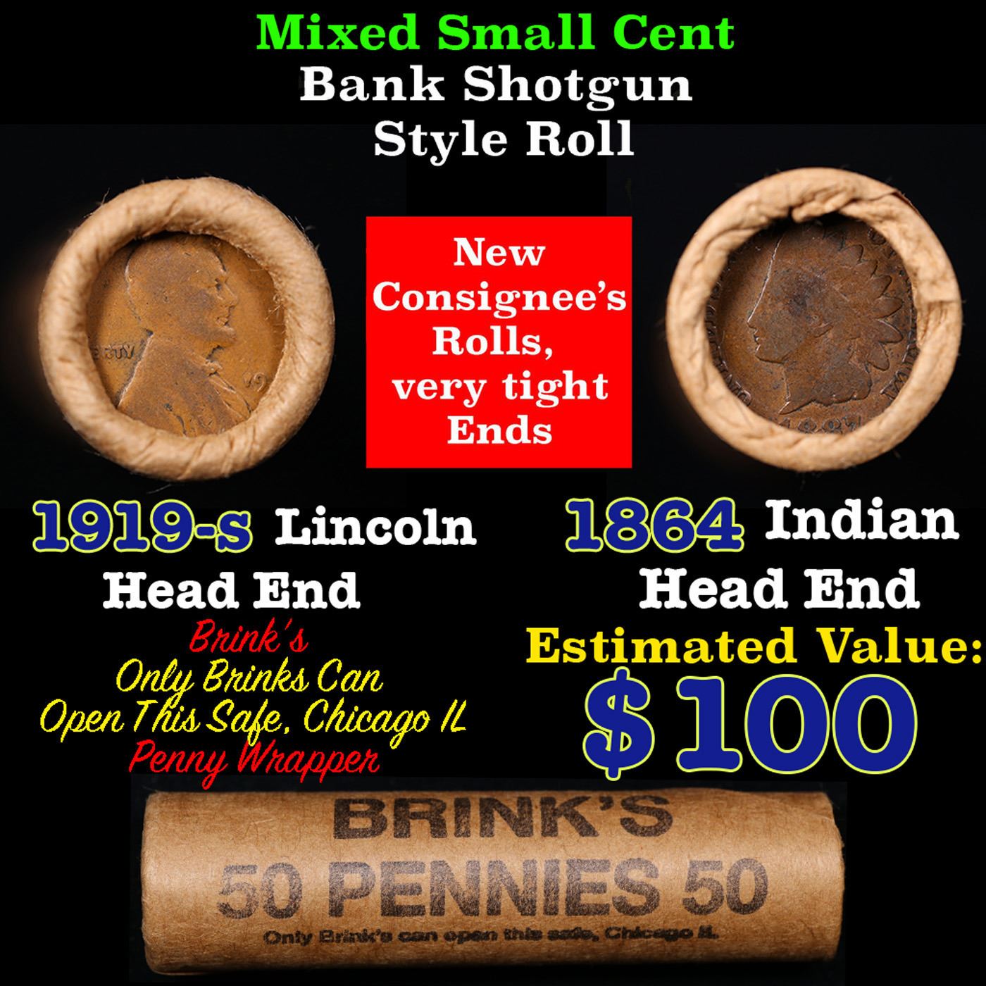 Mixed small cents 1c orig shotgun roll, 1919-s Wheat Cent, 1864 Indian Cent other end, Brinks Wrapper.. The roll is held in an old Rare & Collectable Brinks 'Only Brinks Can Open This Safe, Chicago IL' Penny wrapper. Actual roll pictured is the roll you will get. A great original bank shotgun roll with very tight ends. We have opened a few of these rolls. They seem to be mixed small cents including Indians, Wheats, Steel cents & some Flying Eagles mixed in. These shotgun rolls are all from a new consignee. They are all frrom one Estate.