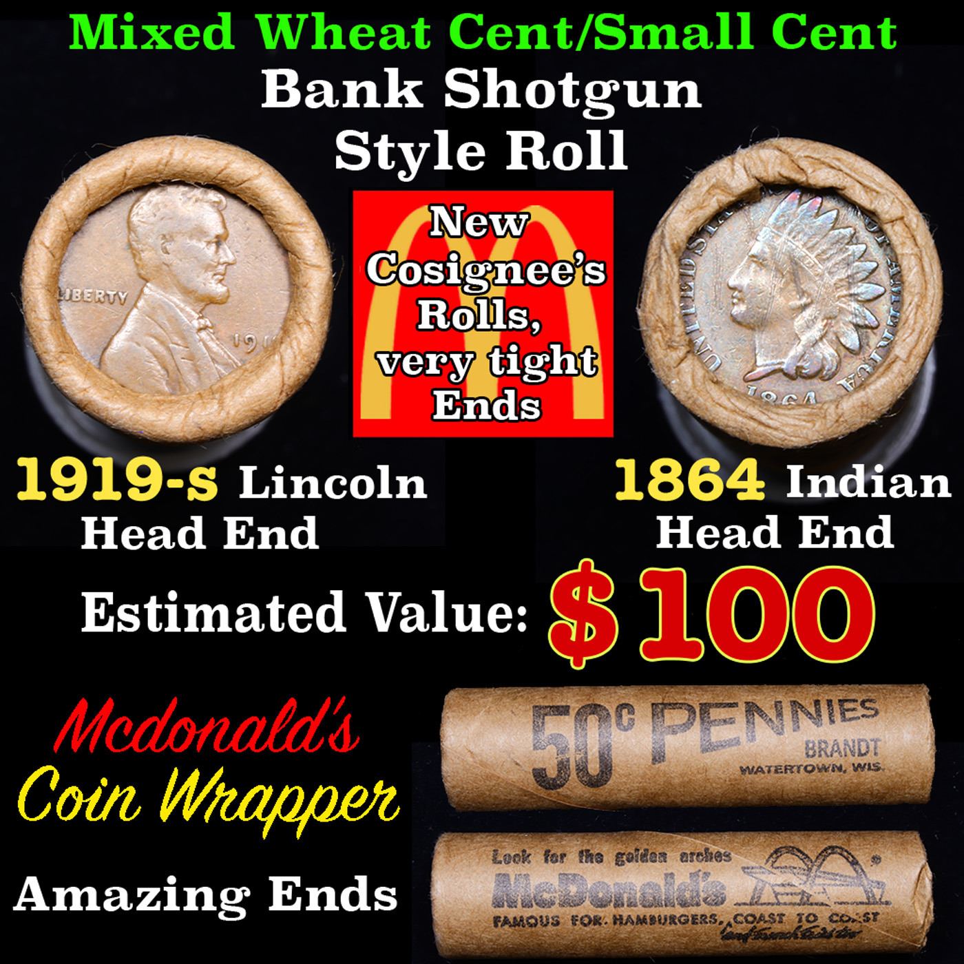 Mixed small cents 1c orig shotgun roll, 1919-s Wheat Cent, 1864Indian cent other end, McDonalds Wrapper Grades. The roll is held in an old Rare & Collectable McDonalds Wrapper. Look for the Golden Arches. Actual roll pictured is the roll you will get. A great original bank shotgun roll with very tight ends. We have opened a few of these rolls. They seem to be mixed small cents including Indians, Wheats, Steel cents & some Flying Eagles mixed in. These shotgun rolls are all from a new consignee. They are all frrom one Estate.