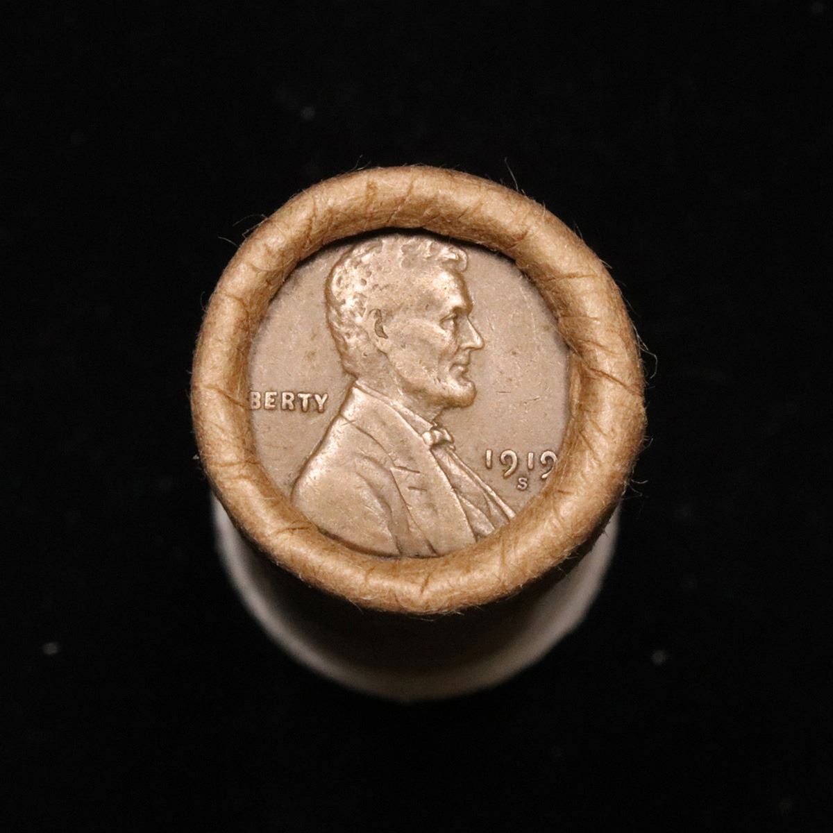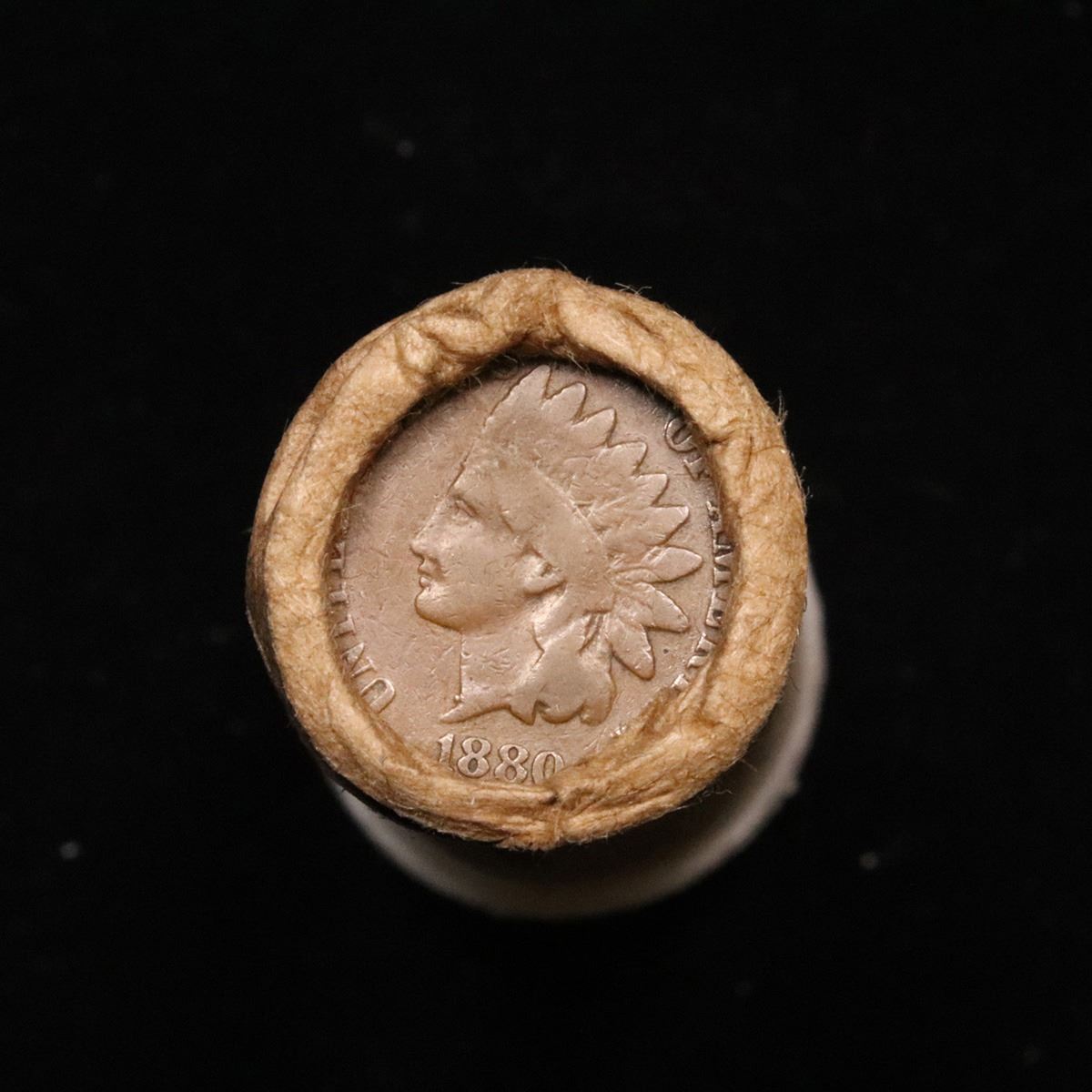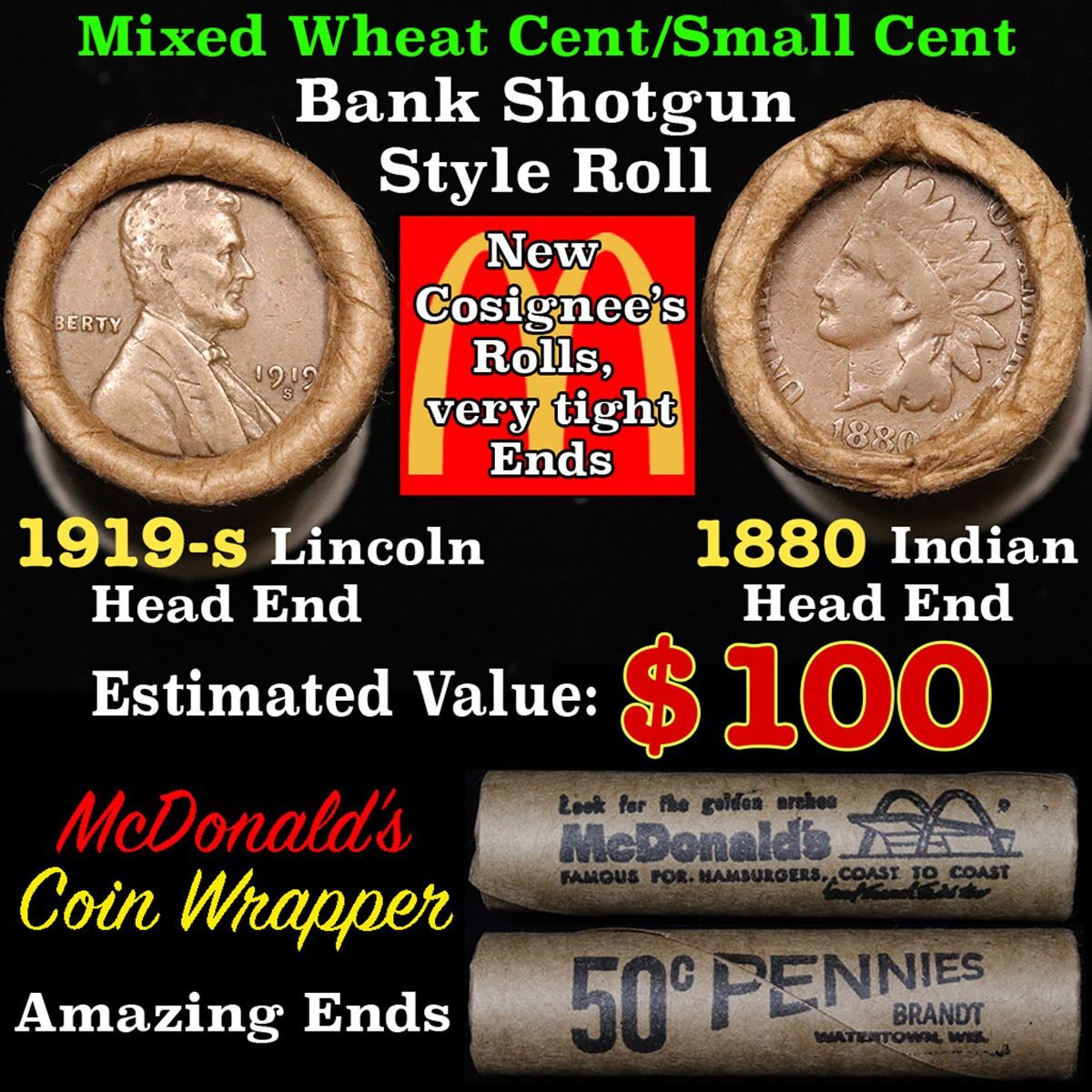 Mixed small cents 1c orig shotgun roll, 1919-s Wheat Cent, 1880 Indian Cent other end. The roll is held in an old Rare & Collectable McDonalds Brandt wrapper. Actual roll pictured is the roll you will get. A great original bank shotgun roll with very tight ends. We have opened a few of these rolls. They seem to be mixed small cents including Indians, Wheats, Steel cents & some Flying Eagles mixed in. These shotgun rolls are all from a new consignee. They are all frrom one Estate.