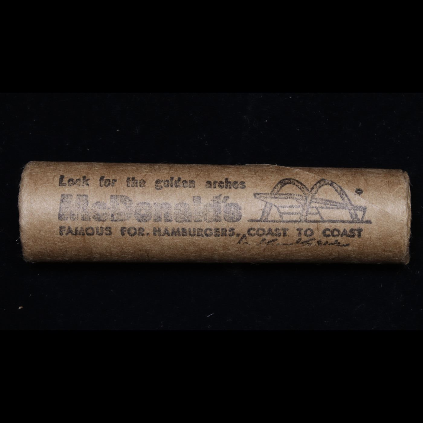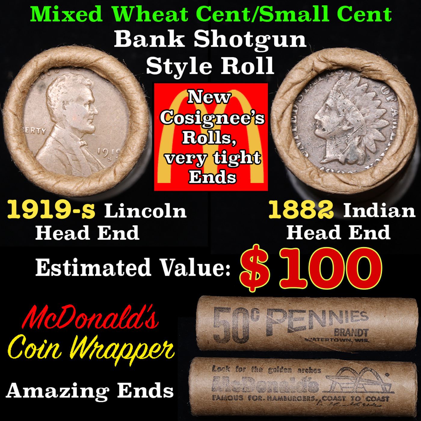 Mixed small cents 1c orig shotgun roll, 1919-s Wheat Cent, 1882 Indian Cent other end, McDonalds Wrapper Grades. The roll is held in an old Rare & Collectable McDonalds Brandt wrapper. Look For The Golden Arches. Actual roll pictured is the roll you will get. A great original bank shotgun roll with very tight ends. We have opened a few of these rolls. They seem to be mixed small cents including Indians, Wheats, Steel cents & some Flying Eagles mixed in. These shotgun rolls are all from a new consignee. They are all frrom one Estate.