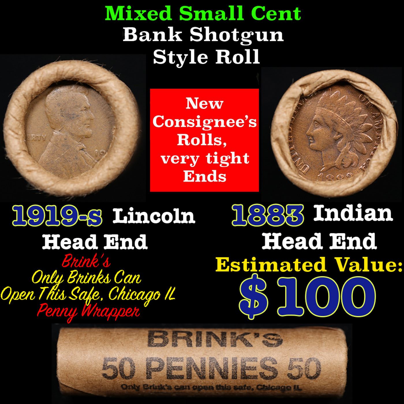 Mixed small cents 1c orig shotgun roll, 1919-s Wheat Cent, 1883 Indian Cent other end, Brinks Wrapper. The roll is held in an old Rare & Collectable Brinks Wrapper. Actual roll pictured is the roll you will get. A great original bank shotgun roll with very tight ends. We have opened a few of these rolls. They seem to be mixed small cents including Indians, Wheats, Steel cents & some Flying Eagles mixed in. These shotgun rolls are all from a new consignee. They are all frrom one Estate.