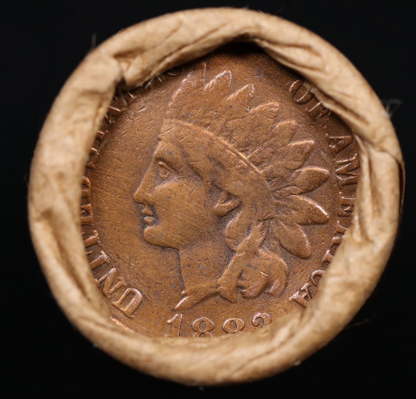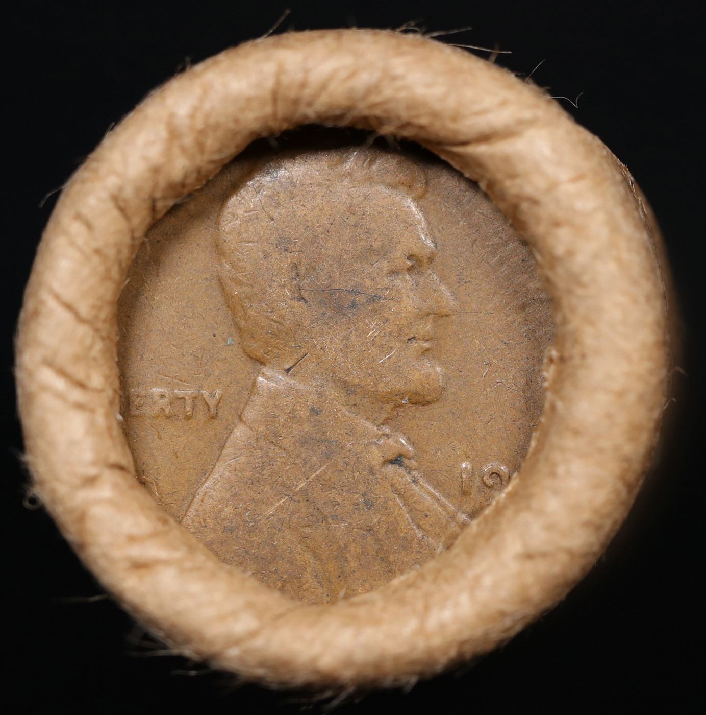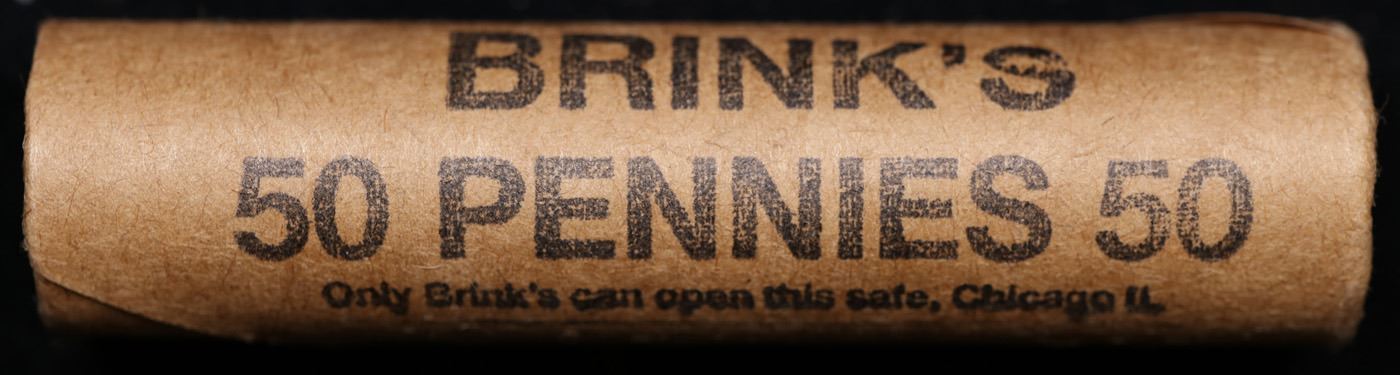 Mixed small cents 1c orig shotgun roll, 1919-s Wheat Cent, 1883 Indian Cent other end, Brinks Wrappe